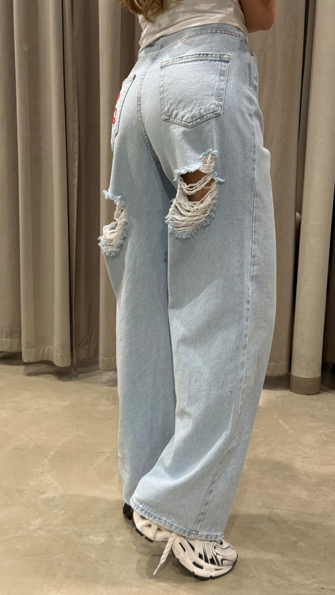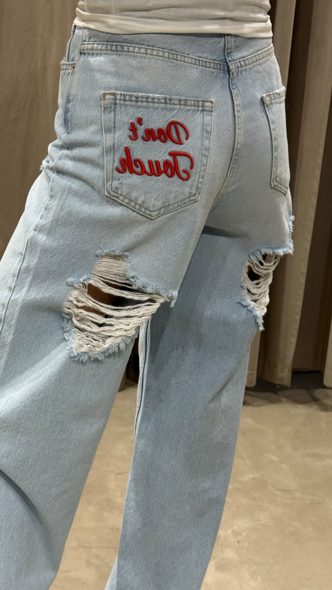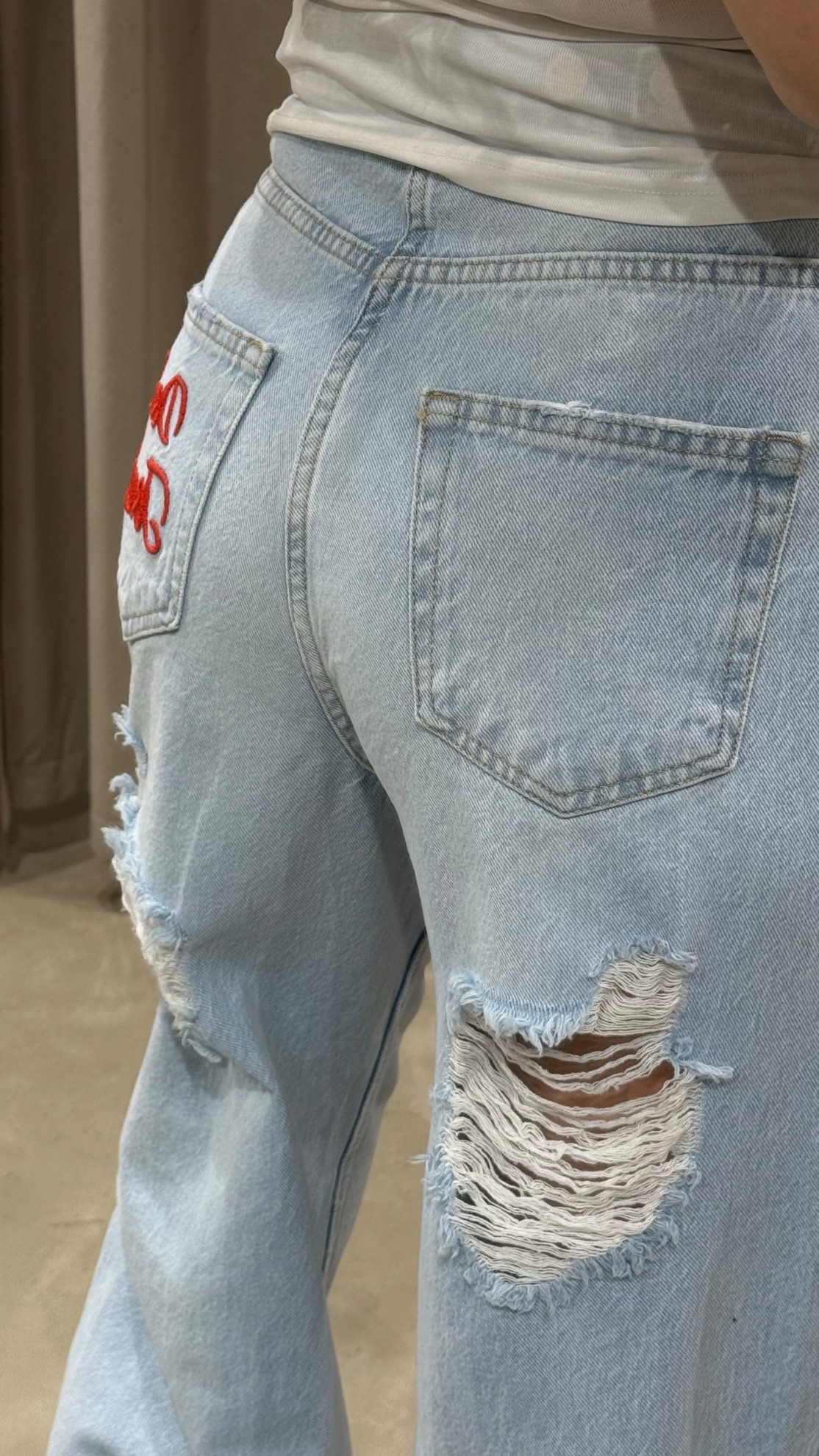 Джинсы прямого свободного кроя с высокой посадкой и крупными рваными разрезами сзади. Хлопковый светло-голубой деним с эффектом потертости. Задние накладные карманы, на одном из карманов контрастная вышивка. Застежка на молнию и пуговицу, шлевки для ремня.