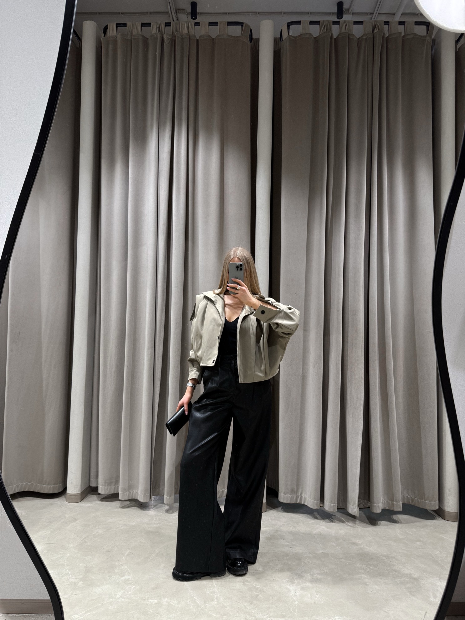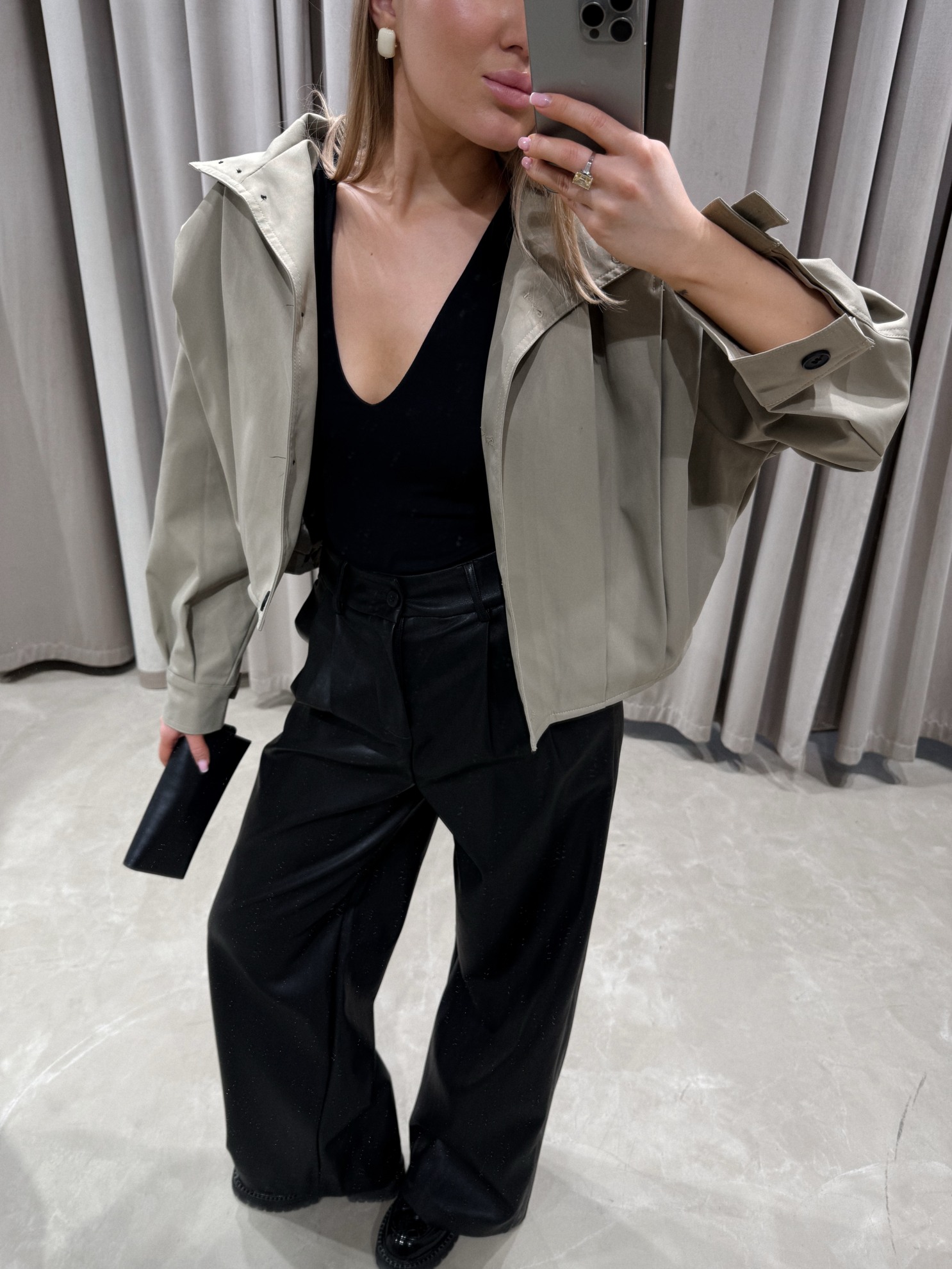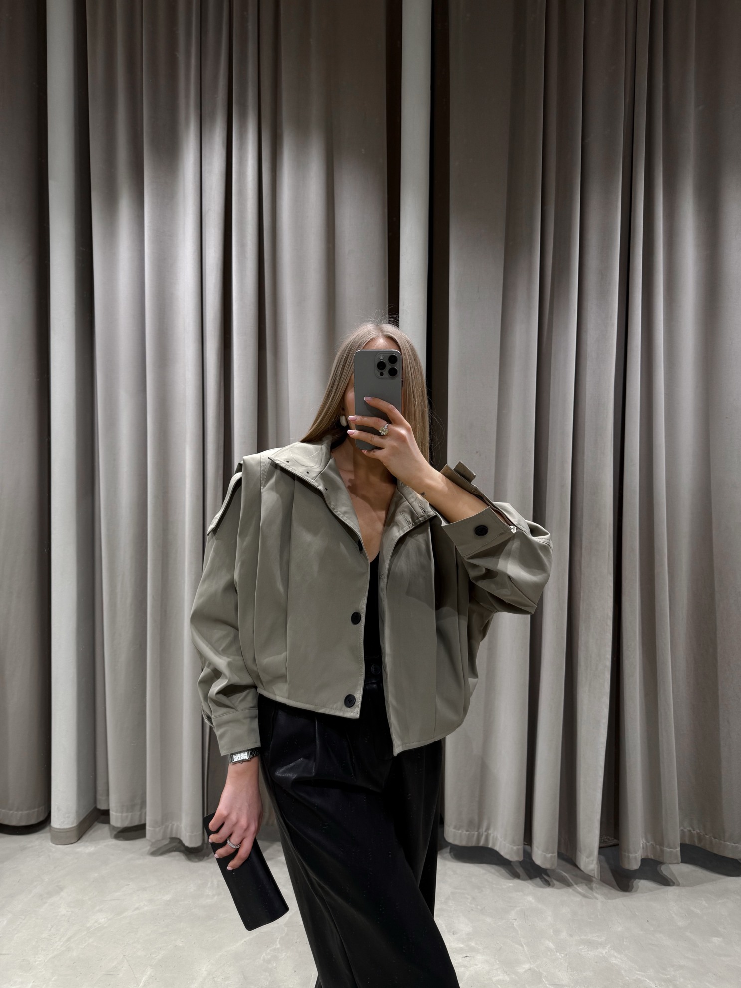 Укороченный тренч свободного кроя с отложным воротником и погончиками на плечах. Застежка на кнопки спереди. Длинные рукава с манжетами на пуговицах. Ровный низ. Выполнен из плотной однотонной ткани.