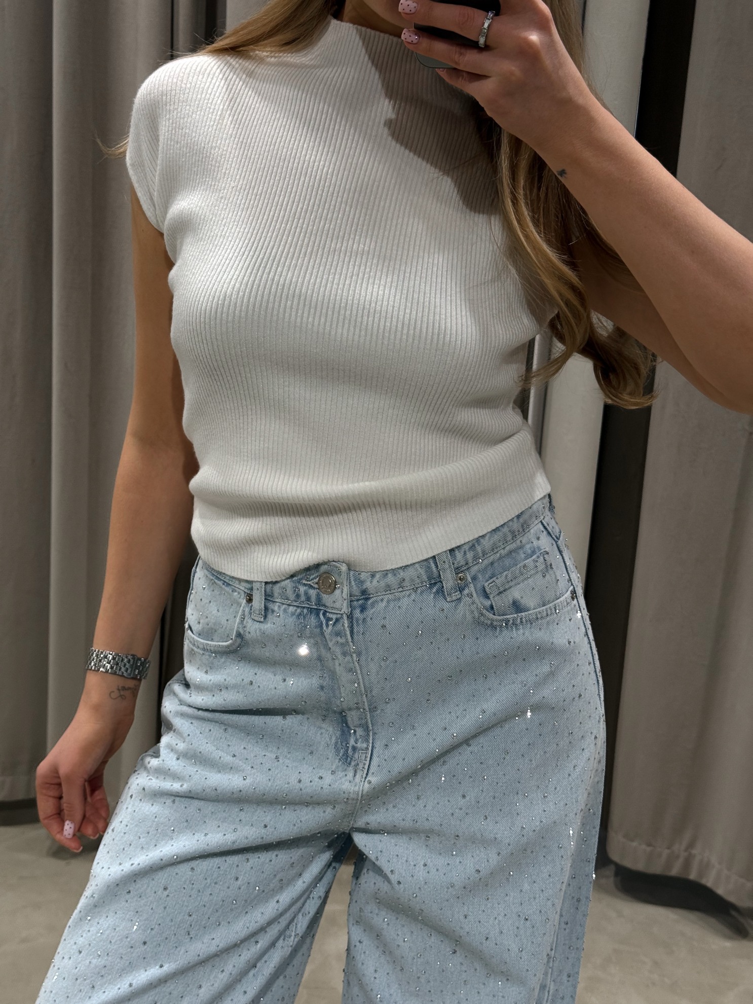 Трикотажный топ без рукавов с высоким воротом и фактурным рубчиком по всей поверхности. Прилегающий крой из эластичного материала.