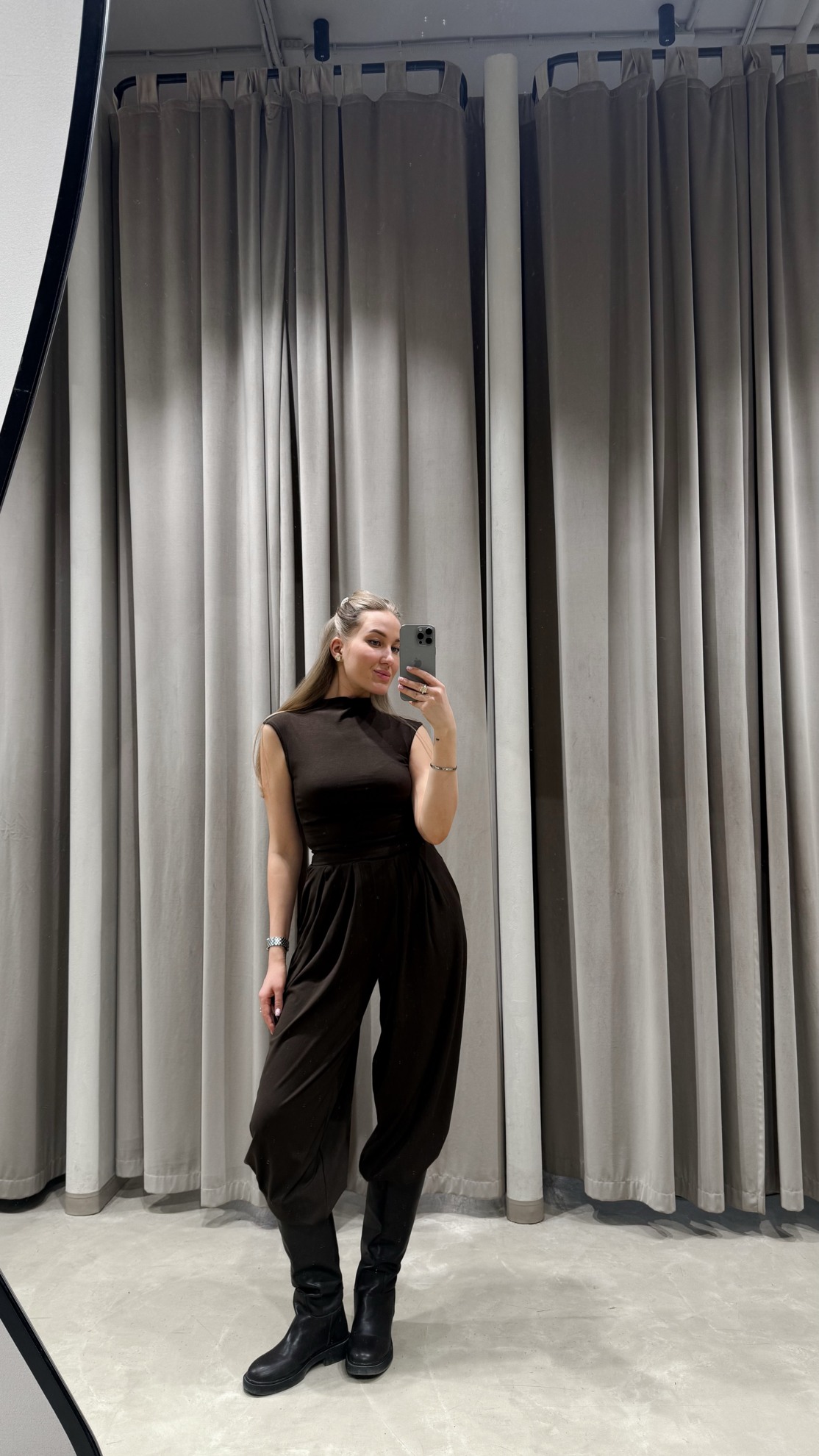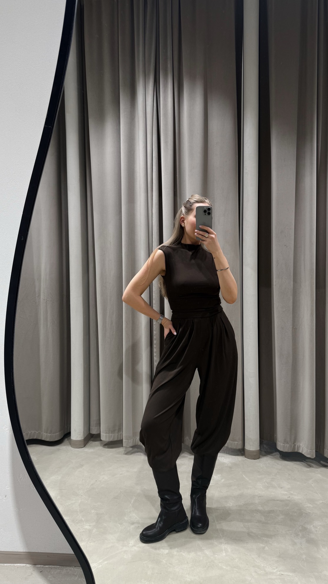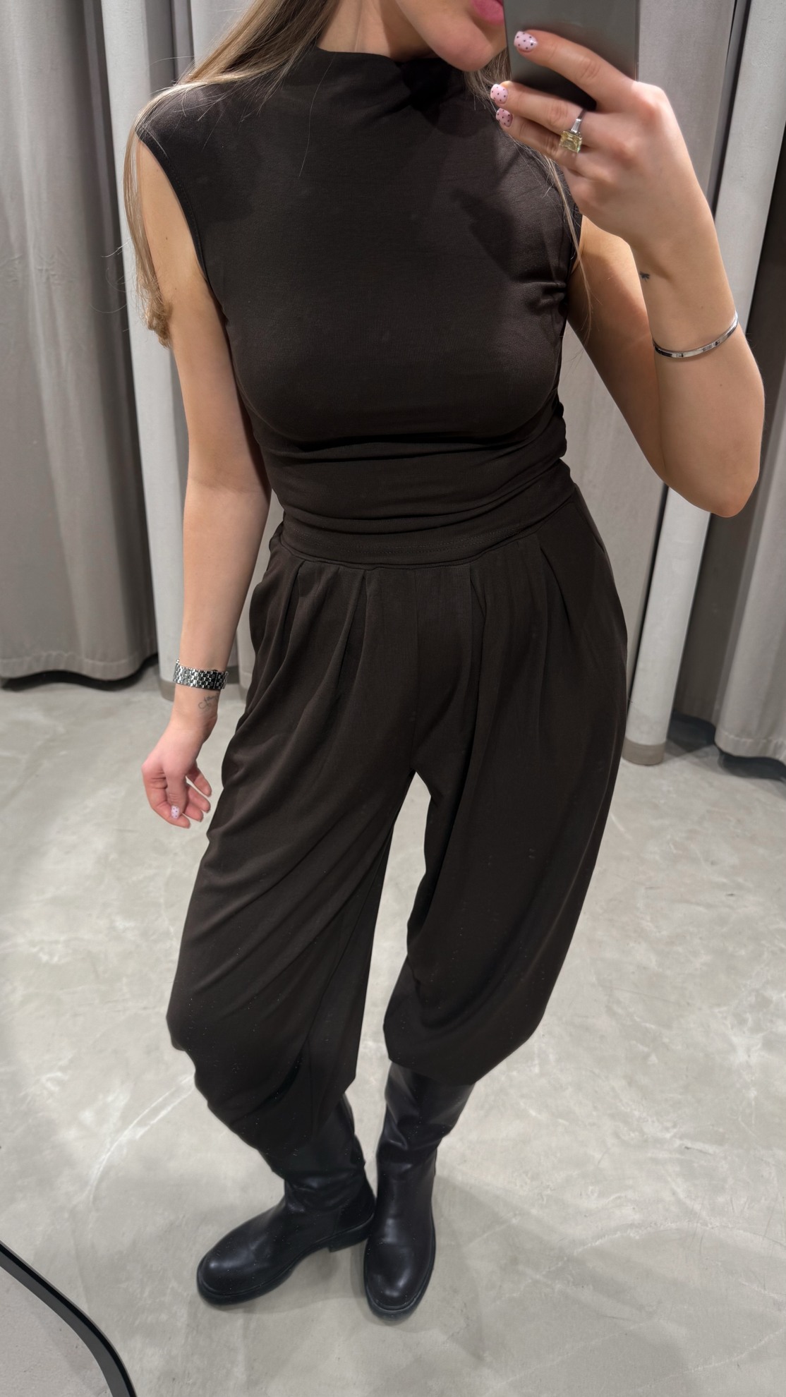 Трикотажный безрукавный топ с высоким воротником и прилегающим силуэтом. Широкие брюки с завышенной линией талии, мягкими складками у пояса и заужением к низу.