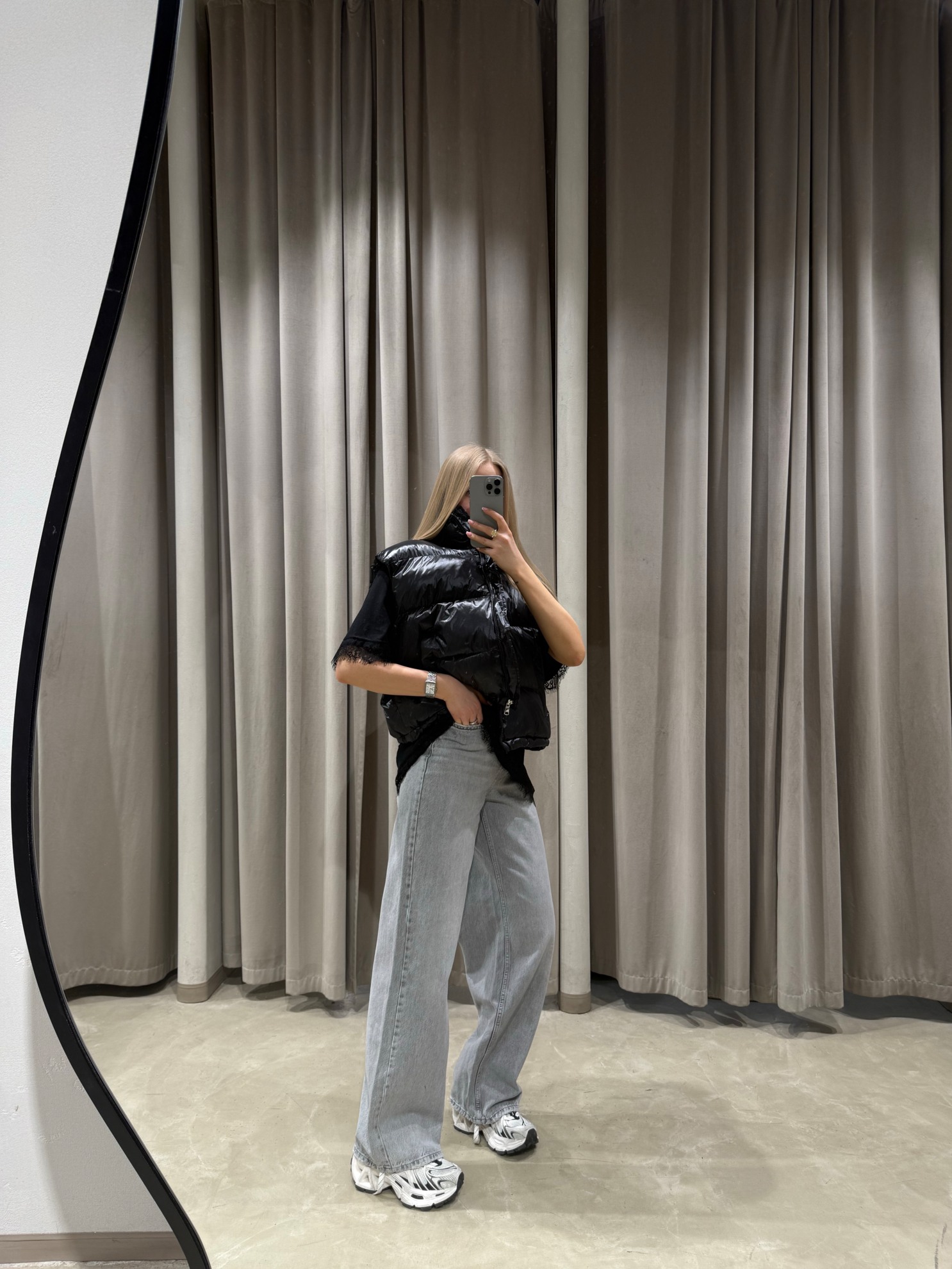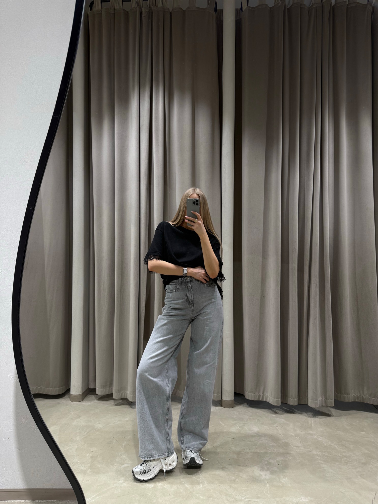 Прямые джинсы свободного кроя с высокой посадкой и удлиненными штанинами. Светло-серый хлопковый деним без декоративных потертостей. Классический пятикарманный крой со шлевками для ремня. Застежка на пуговицу и молнию спереди.