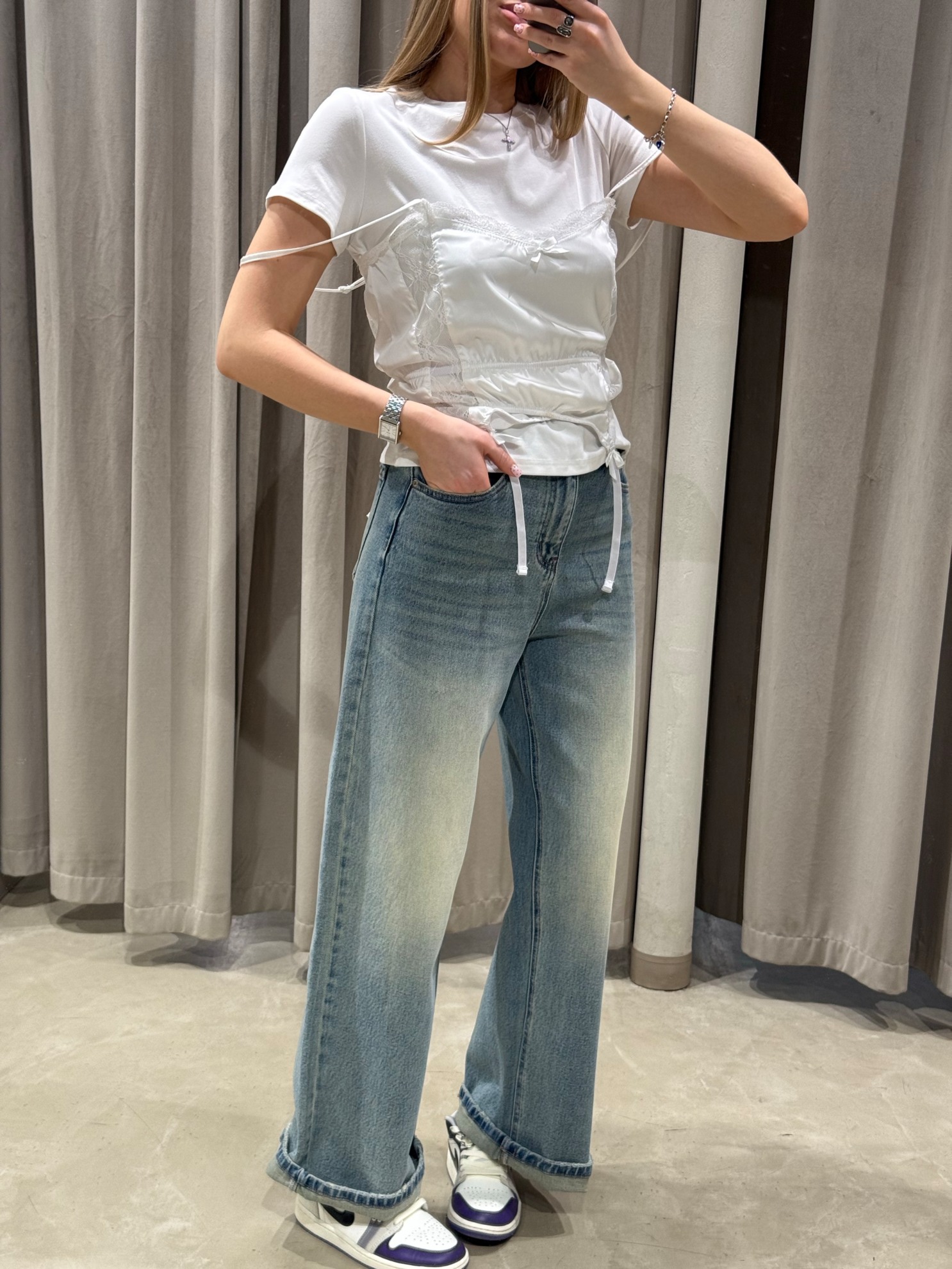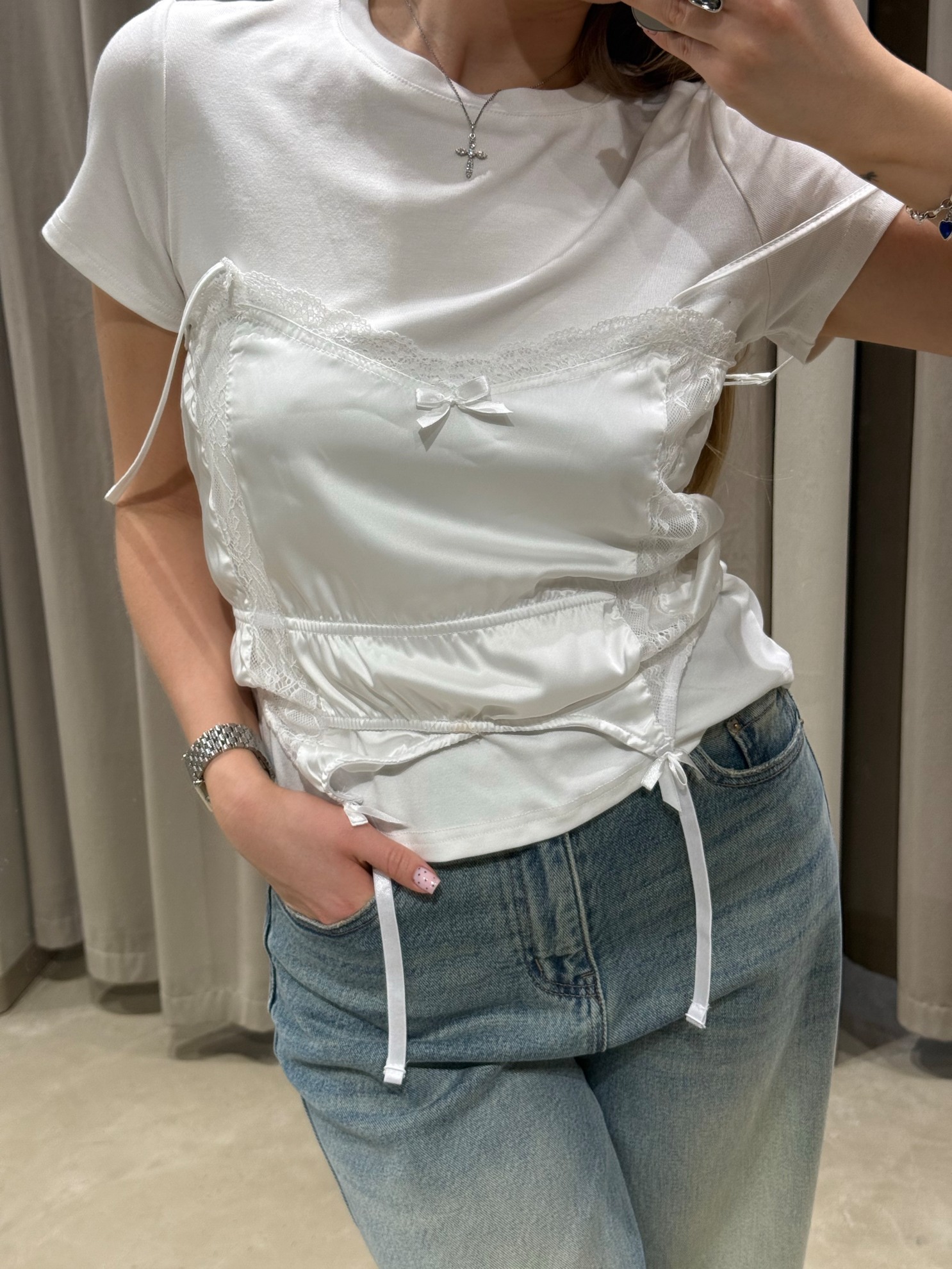 Футболка прямого кроя с круглым вырезом горловины и короткими рукавами. Втачной верхний слой в виде атласного топа с кружевной отделкой, декоративным бантом и кулиской по линии талии. Завязки по бокам и по низу для регулировки посадки.