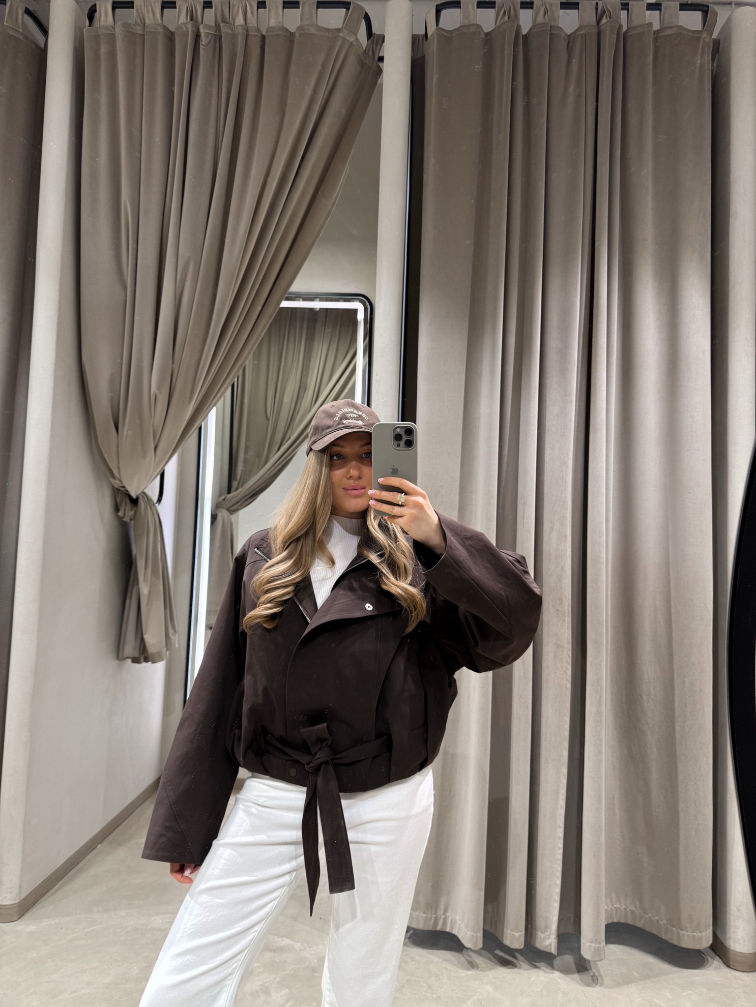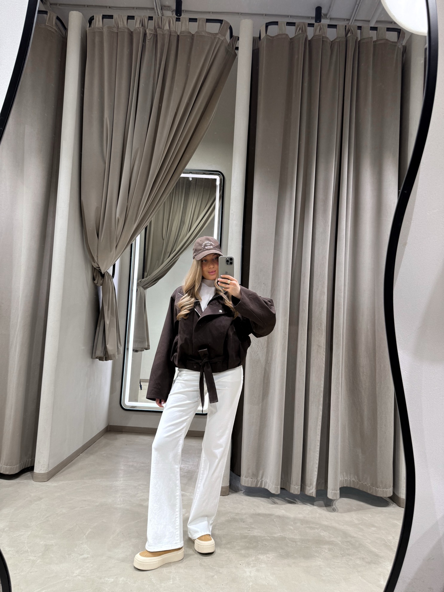 Тренч свободного кроя с запахом и поясом на талии. Отложной воротник, широкие рукава и застежка на кнопки. Однотонная плотная ткань, длина до линии бедер.
