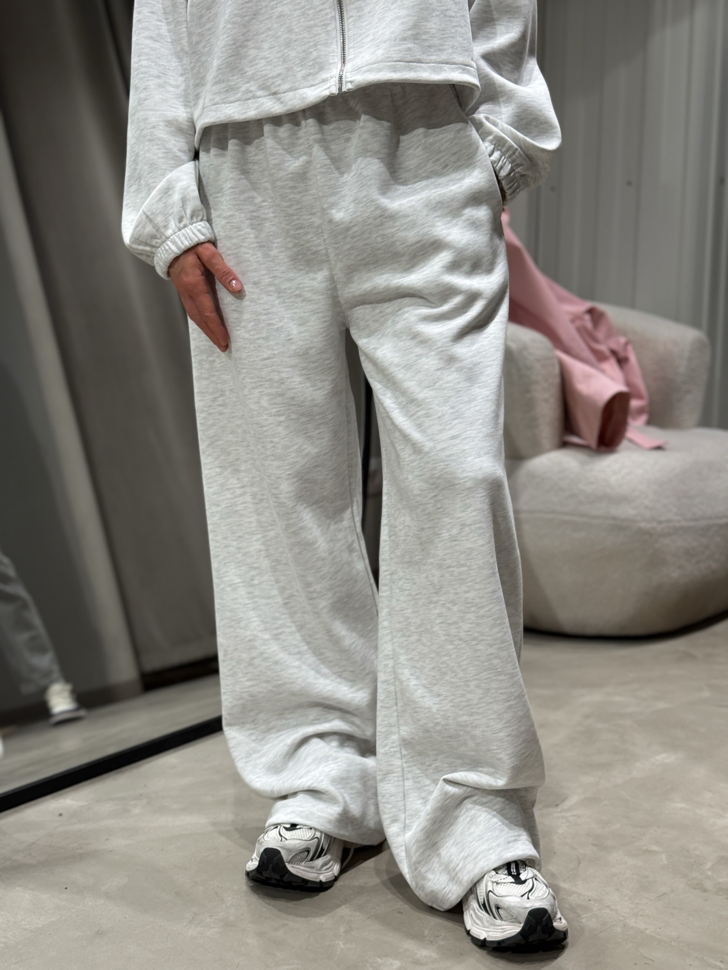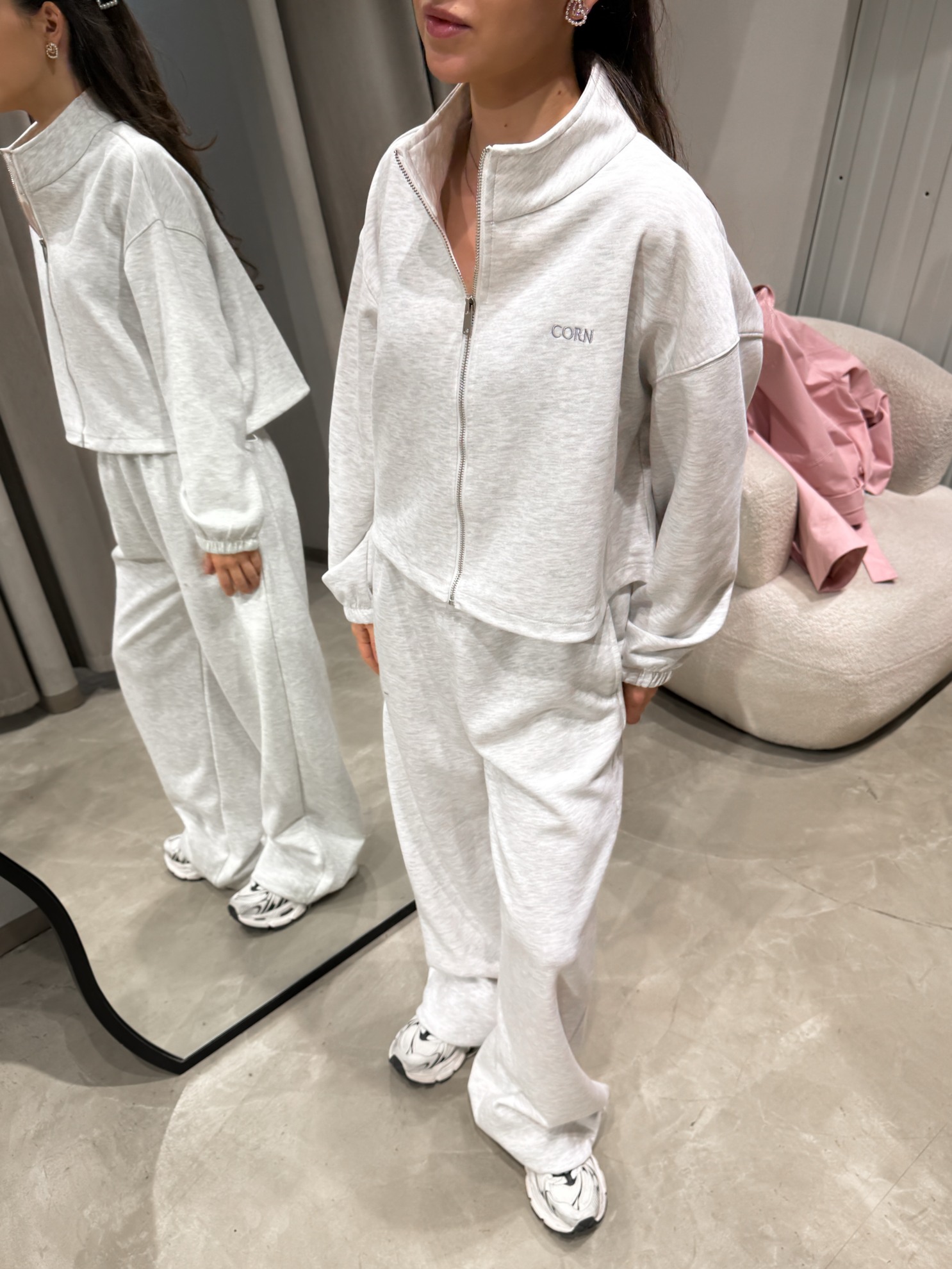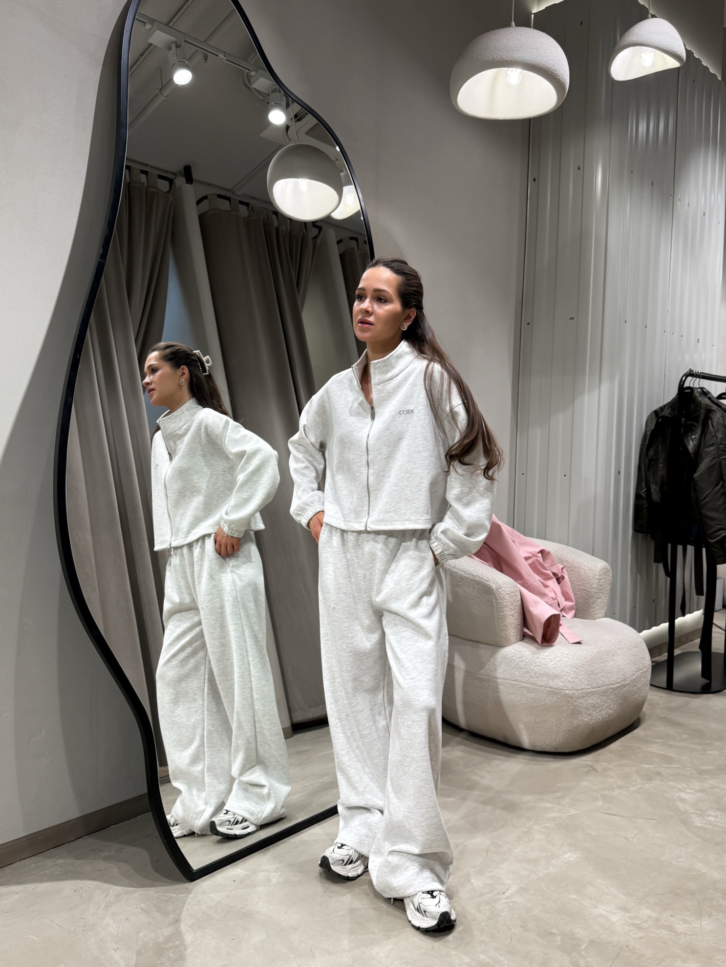 Свободные брюки с высокой посадкой и эластичным поясом. Прямой широкий силуэт с боковыми карманами. Укороченный свитшот на молнии со стоячим воротником и длинными рукавами на резинке. Однотонный трикотажный комплект.