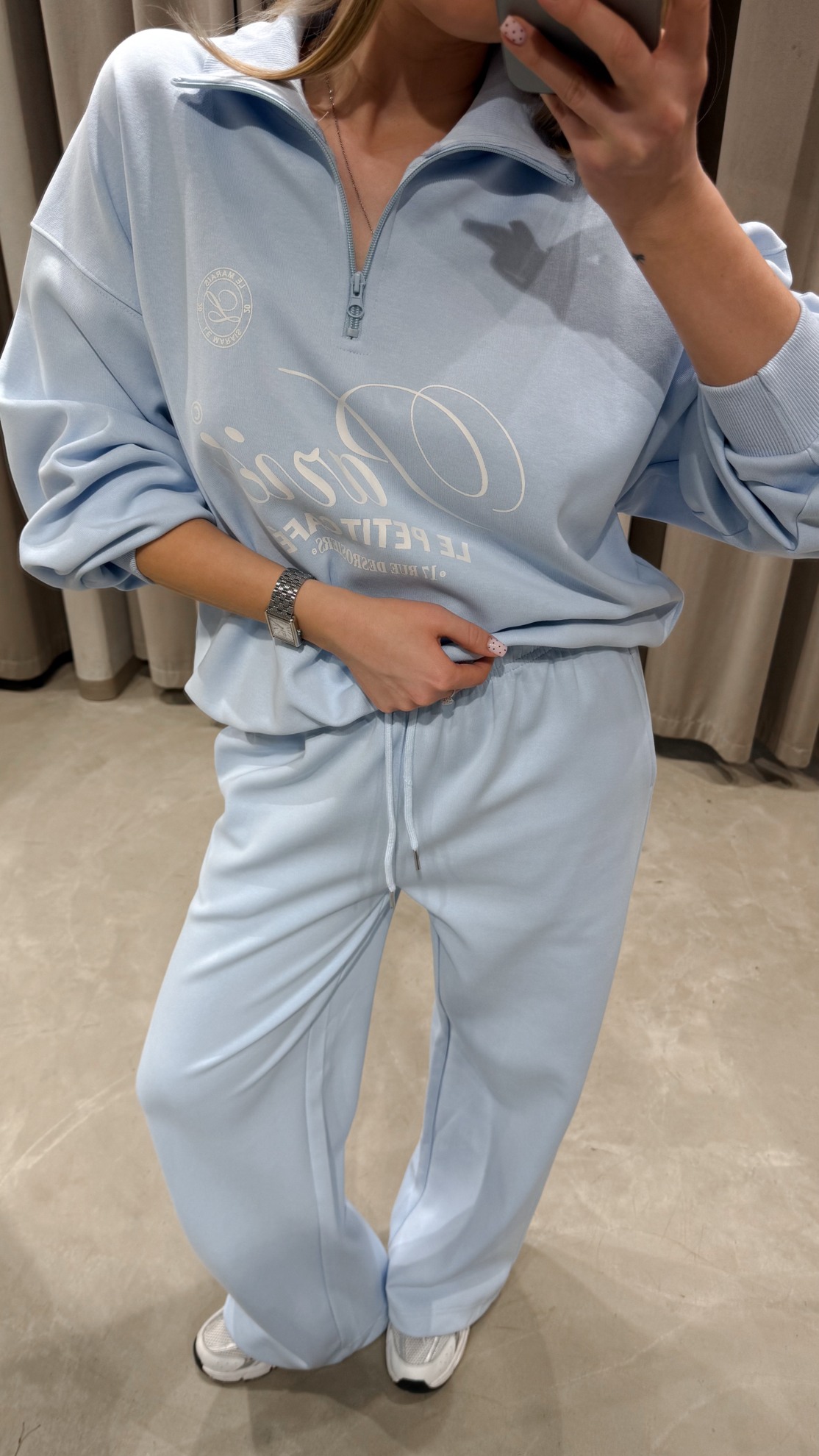 Комплект из укороченного свитшота на короткой молнии с принтом на груди и прямых брюк с эластичным поясом на завязках. Свободный крой из мягкого трикотажа однотонного цвета.