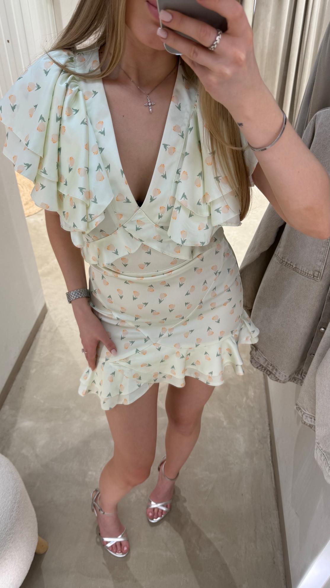 Короткое приталенное платье с V-образным вырезом и лифом на запах. Воланы по лифу и низу изделия. Короткие рукава. Легкая ткань с мелким цветочным принтом. Застежка на спинке.