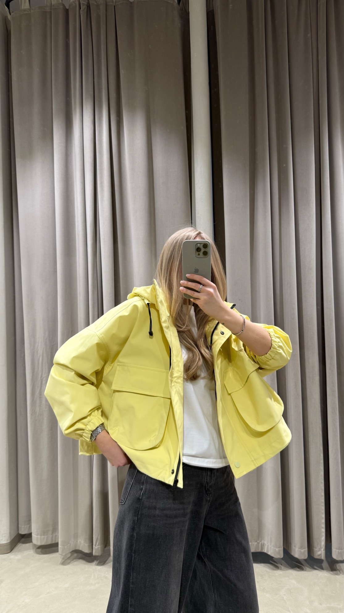 Укороченная ветровка прямого кроя с капюшоном на кулиске и длинными рукавами на резинке. Крупные накладные карманы спереди. Фронтальная застежка на молнию с планкой на кнопках. Шнурок по нижнему краю для регулировки объема.