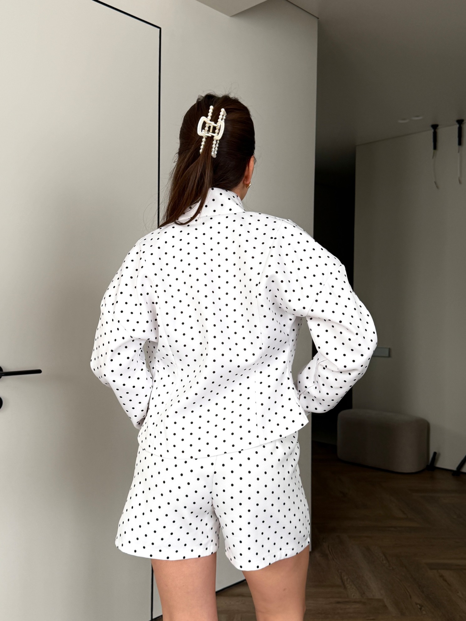 Комплект из шорт и рубашки с воротником-стойкой. Белая ткань с принтом в мелкий черный горох. Прямые шорты до середины бедра с высокой посадкой, застежкой на молнию и пуговицу, боковыми карманами. Рубашка прямого кроя на кнопках с длинными рукавами и манжетами. Контрастный топ прямого силуэта.