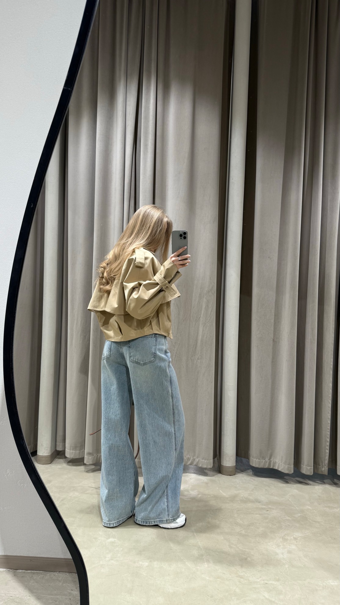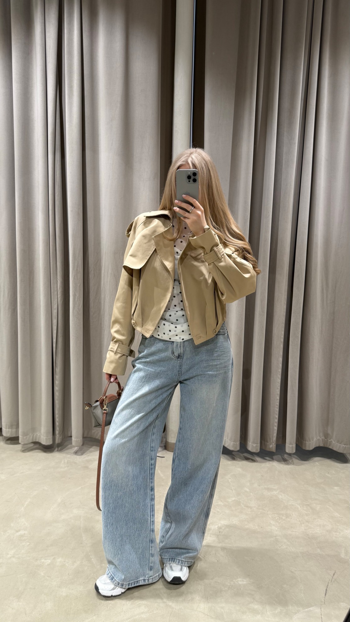 Укороченный тренч свободного кроя с асимметричной кокеткой спереди и сзади. Паты на плечах и манжетах. Длинный рукав. Передняя застежка на кнопки. Отложной воротник. Прямой низ. Выполнен из плотной плащевой ткани.