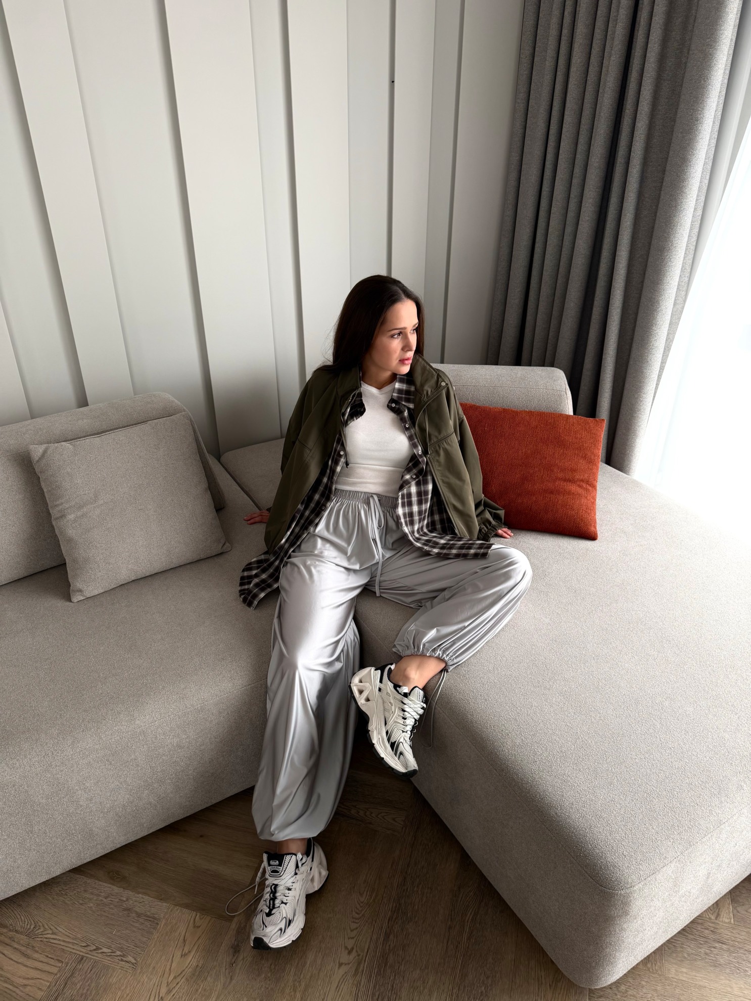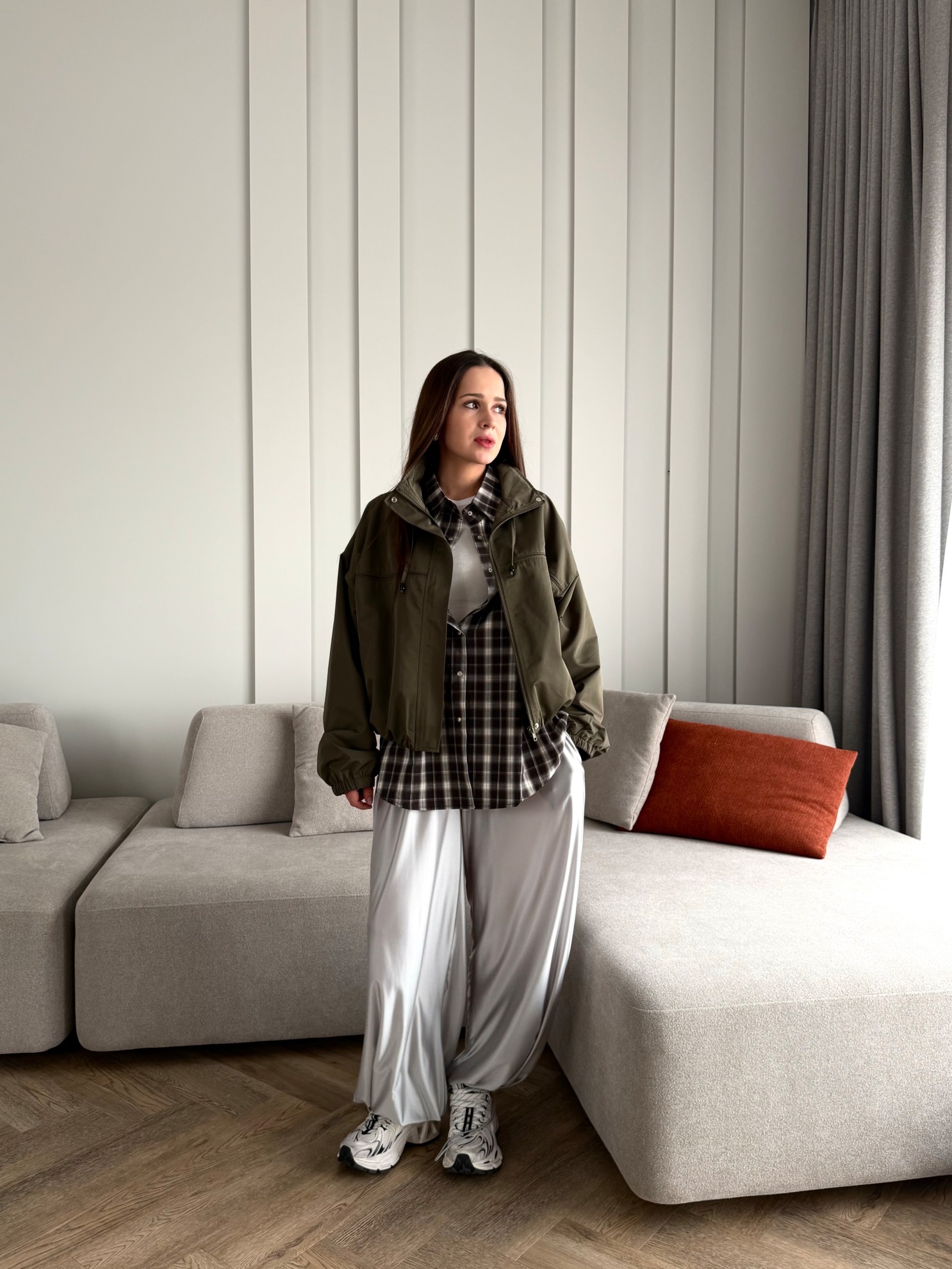 Прямые свободные брюки с высокой посадкой на эластичном поясе с кулиской. Манжеты по низу на резинке. Гладкий однотонный материал с легким блеском.
