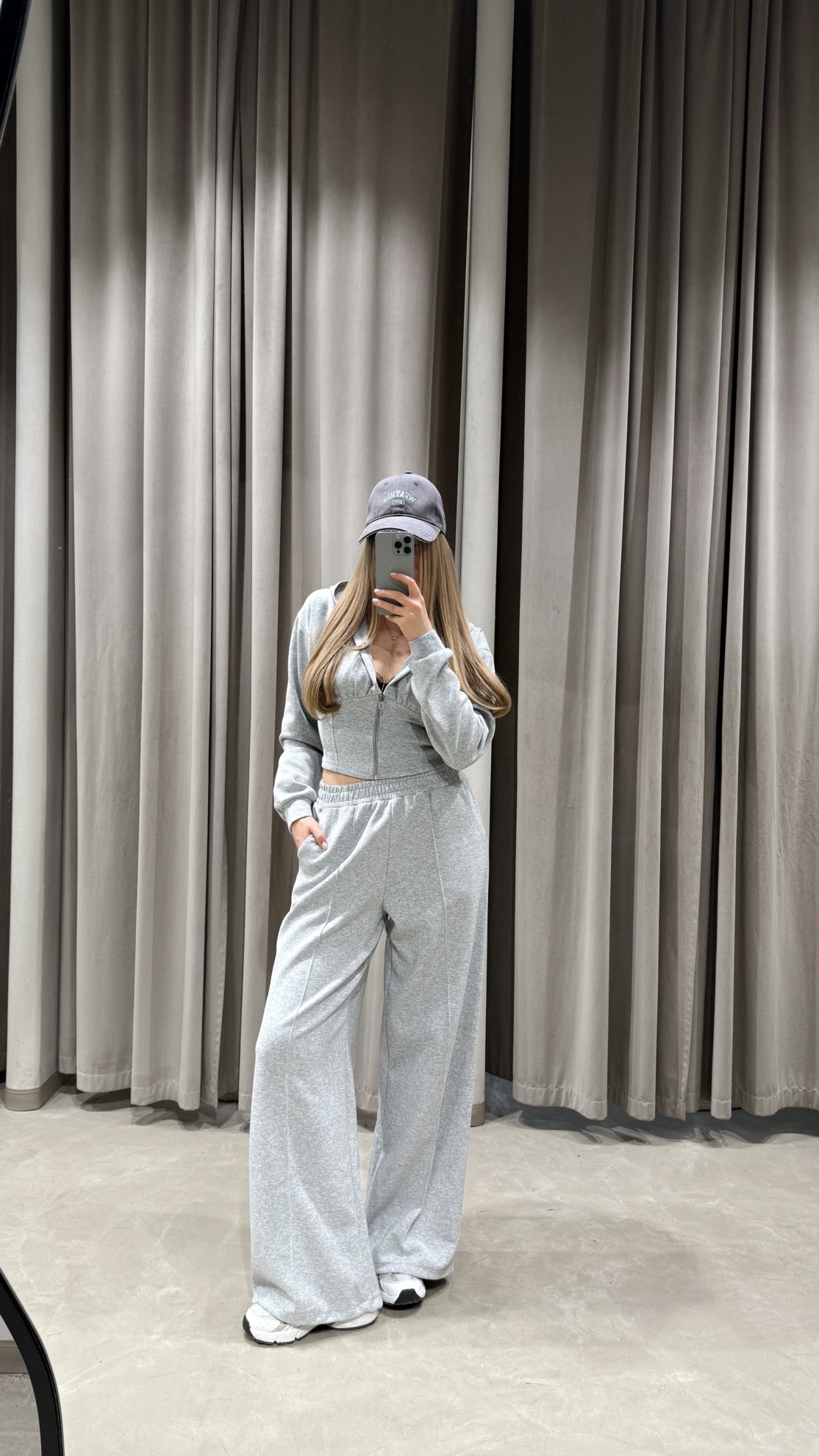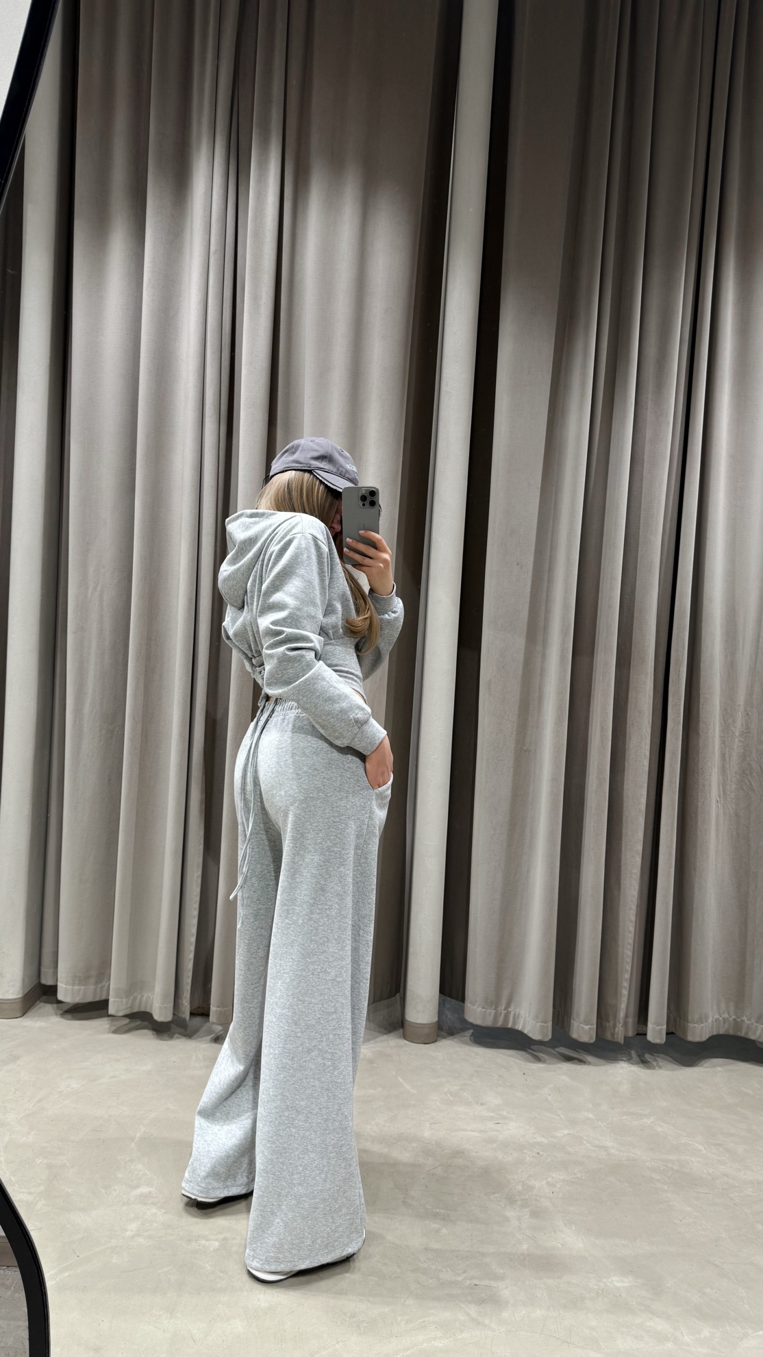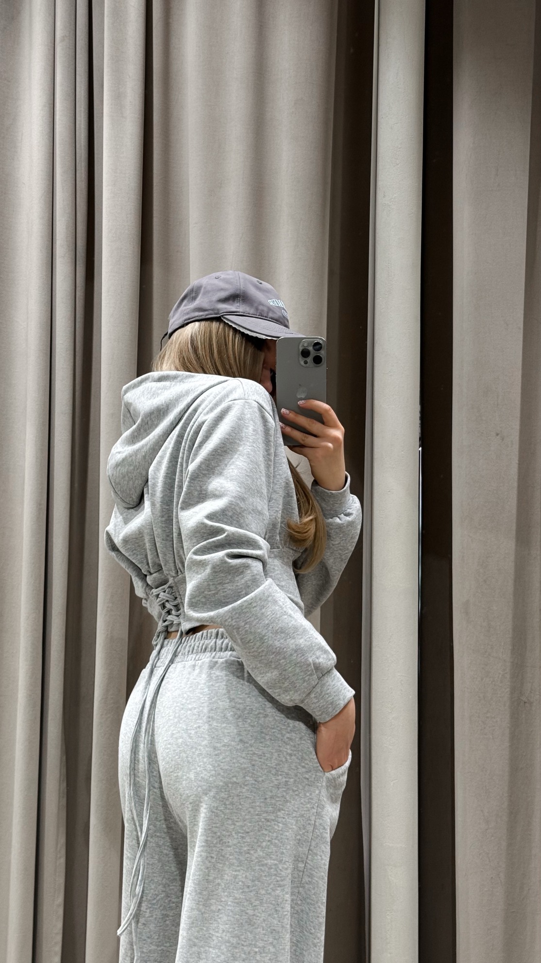 Комплект из мягкого трикотажа с укороченной толстовкой на молнии и капюшоном. Спинка со шнуровкой для регулировки объема. Прямые брюки с широкими штанинами, эластичным поясом и боковыми карманами.