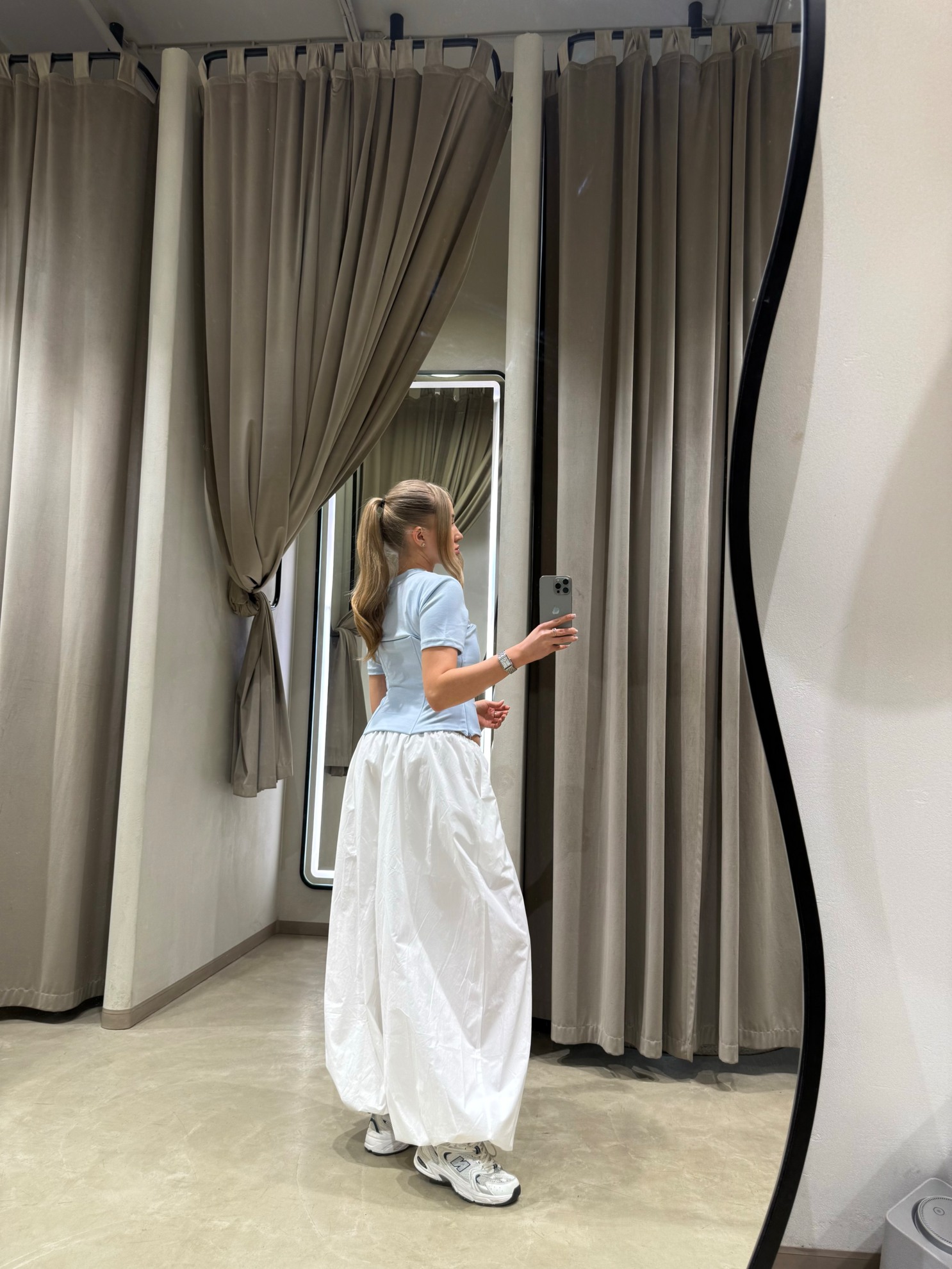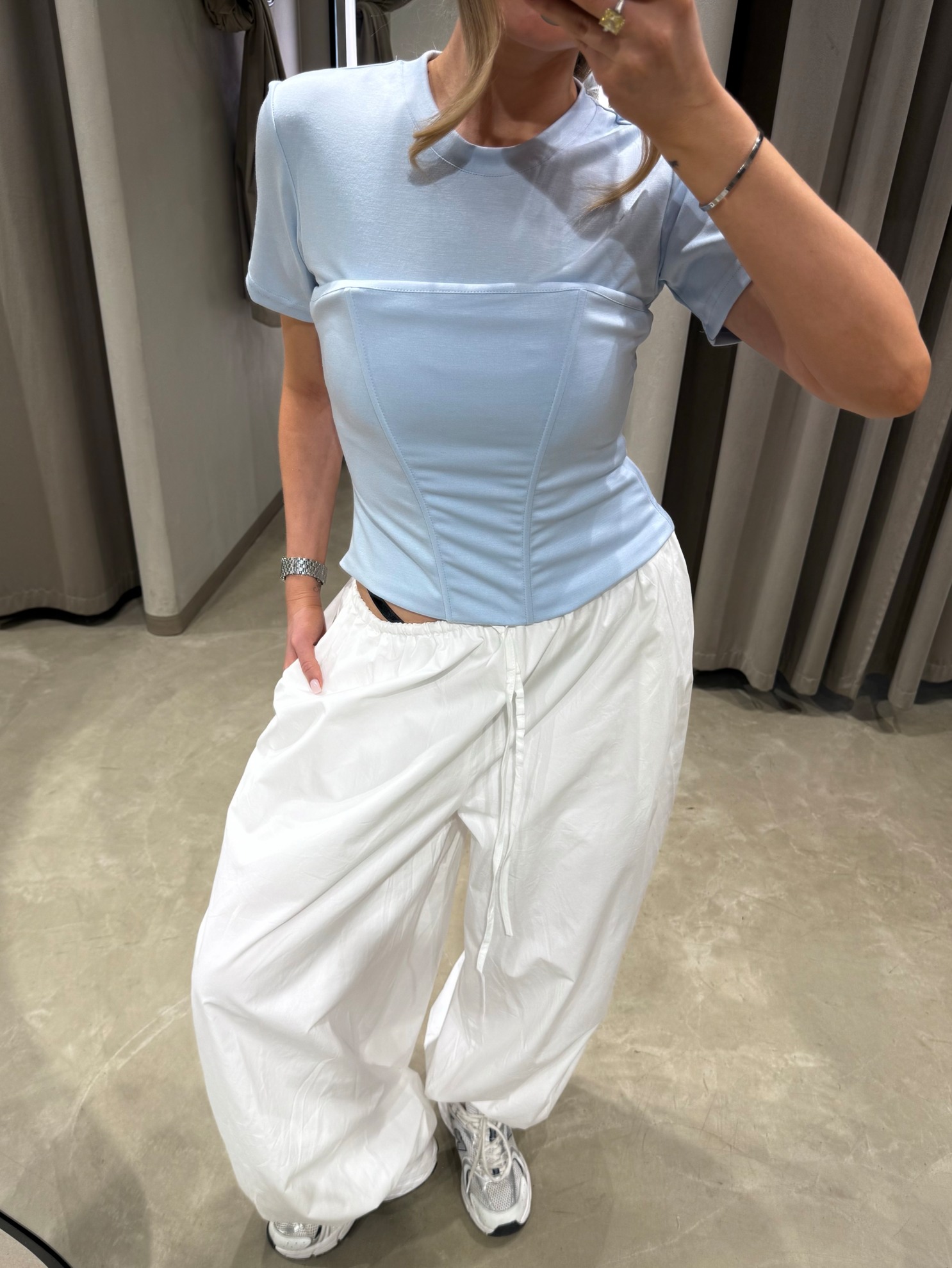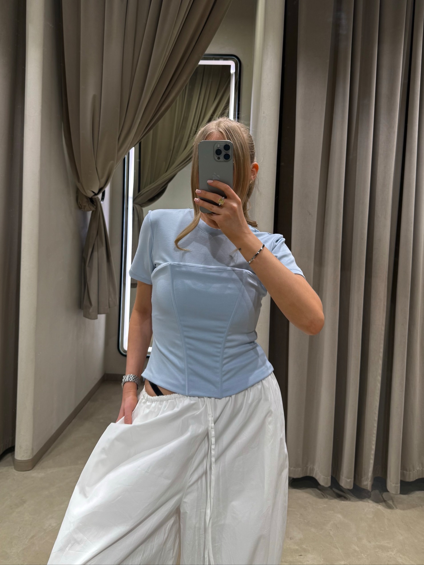 Футболка приталенного кроя с короткими рукавами и круглым вырезом горловины. Передняя часть с корсетными рельефными швами и визуальным разделением лифа. Выполнена из однотонного гладкого трикотажа.