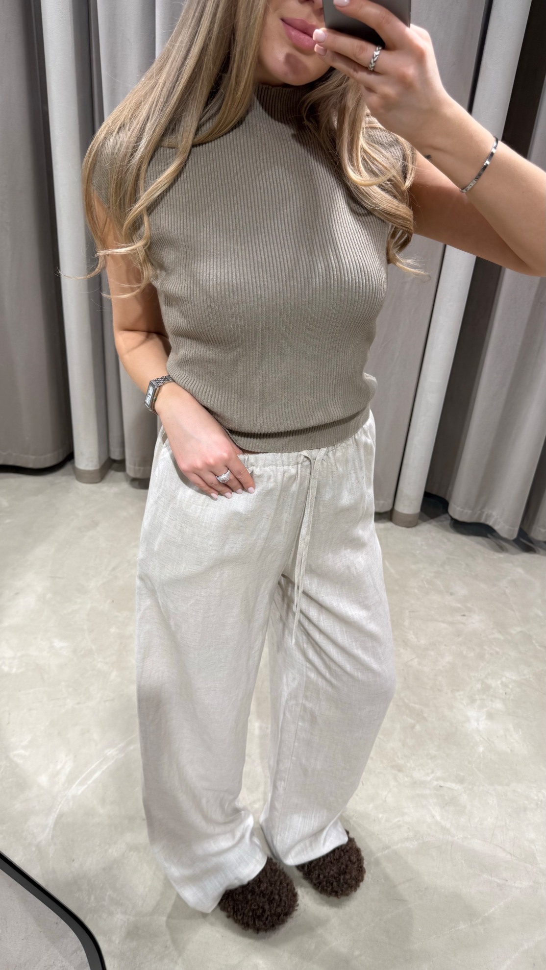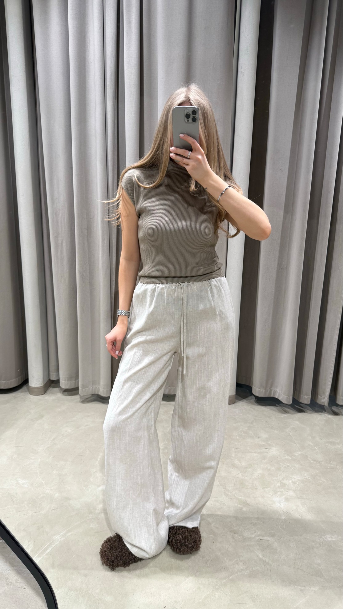 Прямые широкие брюки длины в пол с эластичным поясом и кулиской на талии. Мягкая легкая ткань со слегка текстурированной поверхностью.