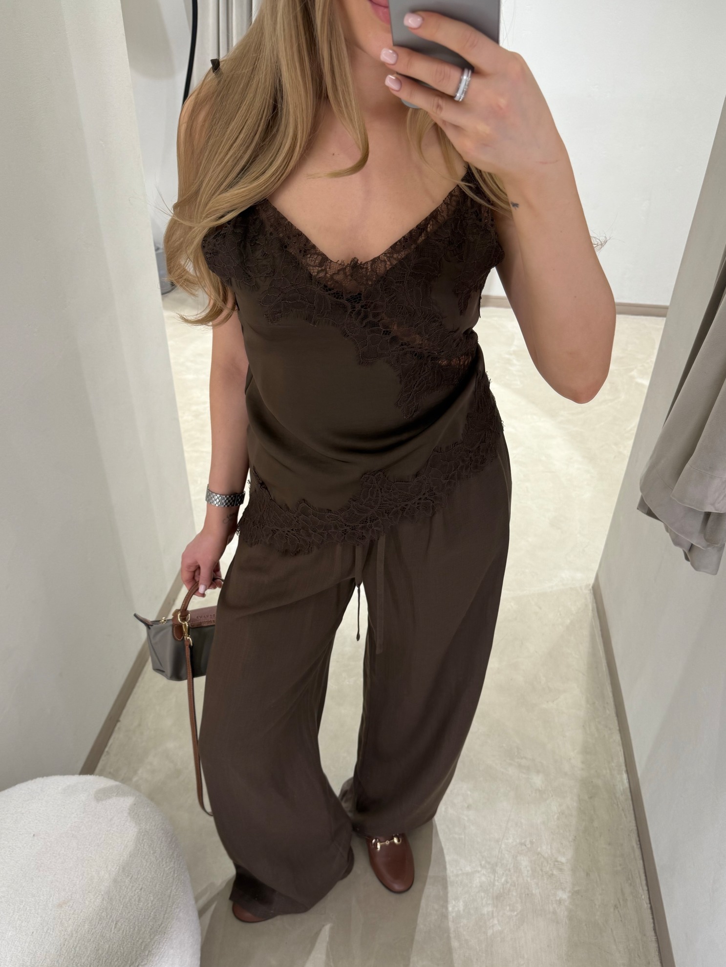 Широкие брюки из легкой однотонной ткани с эластичным поясом и завязками на талии. Длинные прямые штанины без застежки.