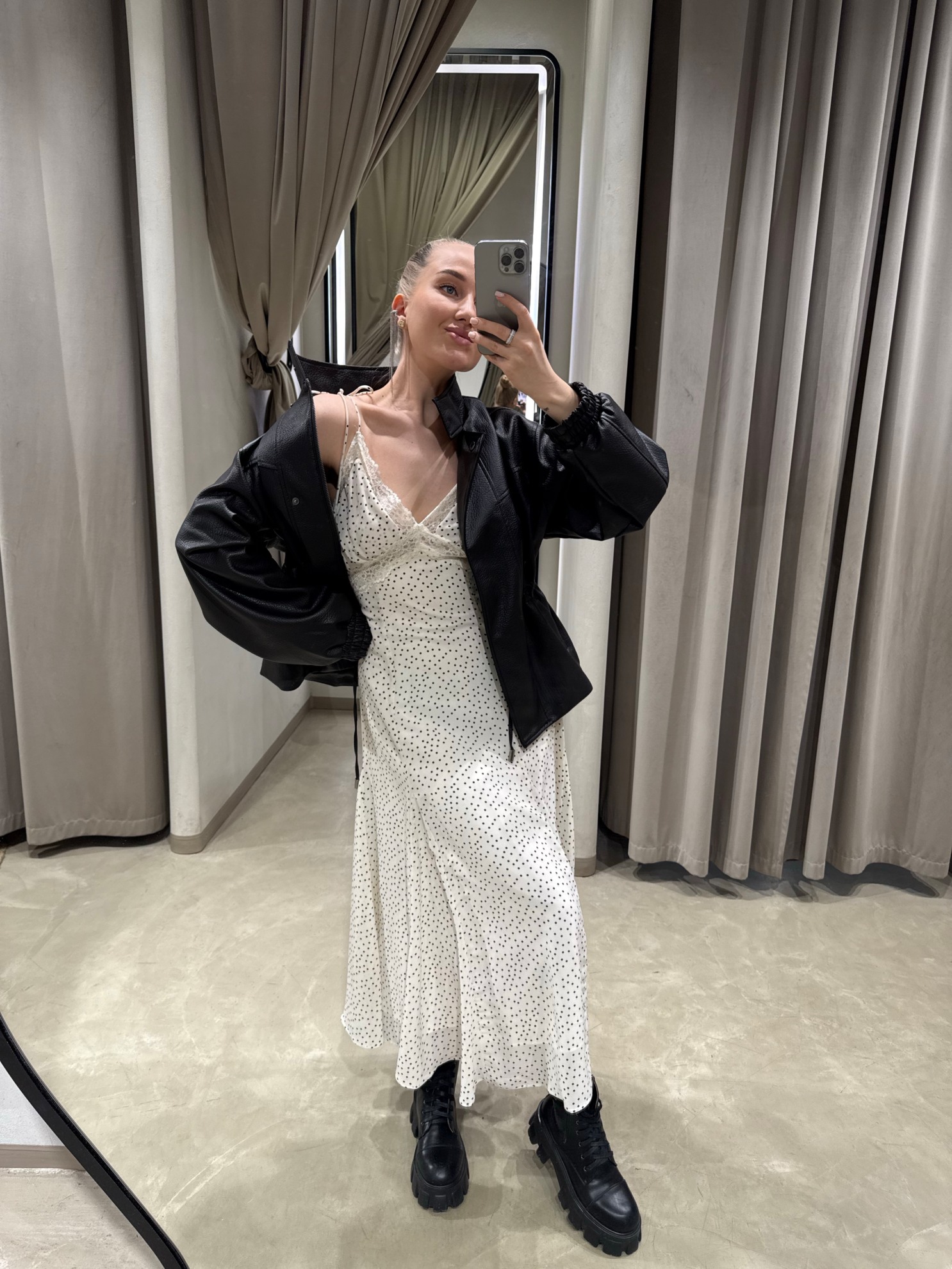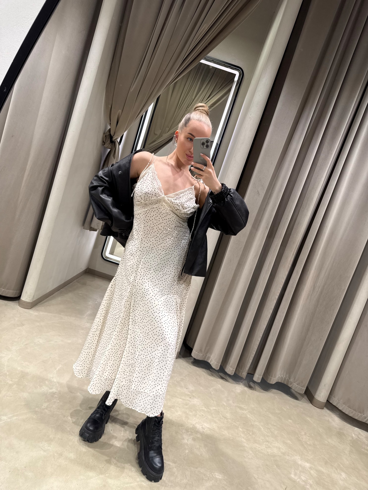 Платье миди длины бельевого кроя на тонких бретелях с V-образным вырезом и драпировкой по лифу. Свободный силуэт с разрезом спереди. Мелкий гороховый принт по всей длине изделия. Легкая ткань.