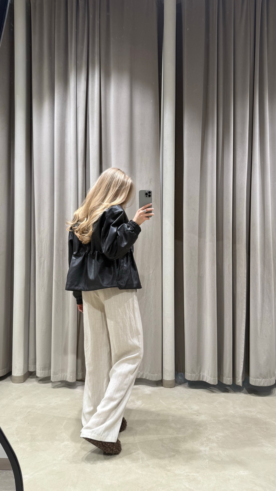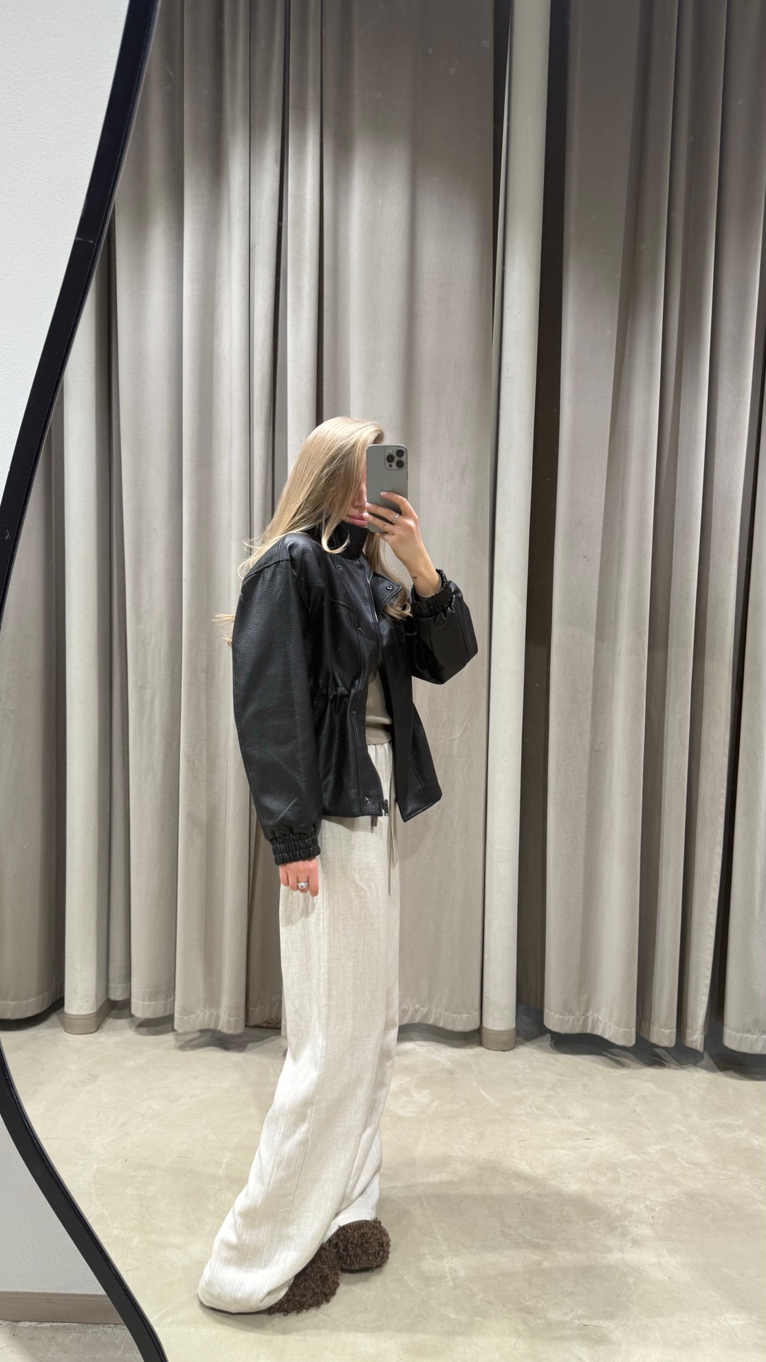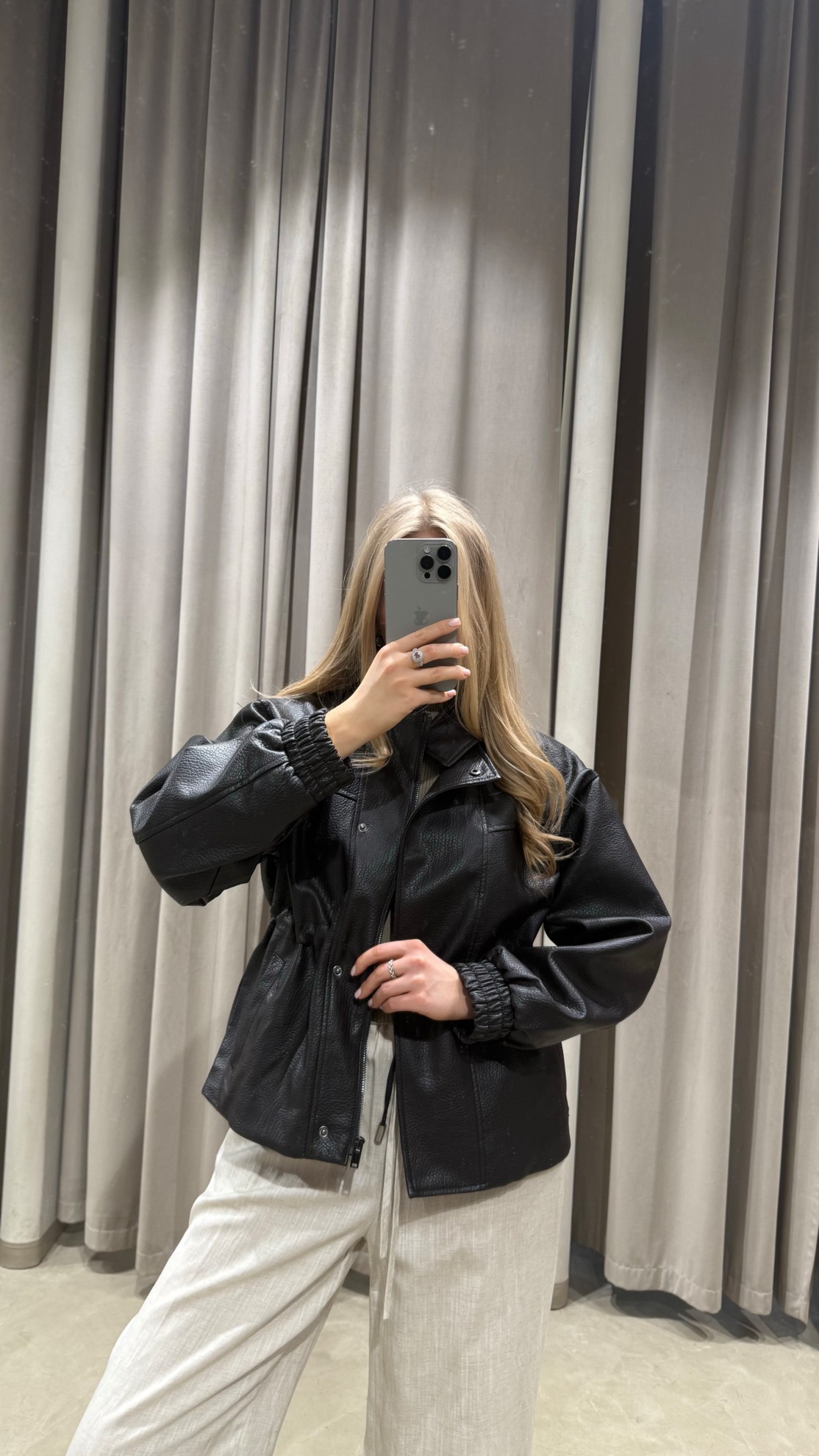 Куртка из фактурной кожи со свободным силуэтом и стягивающей кулиской на талии. Высокий воротник, застежка на молнию с планкой на кнопках. Эластичные манжеты и боковые карманы. Подол средней длины.