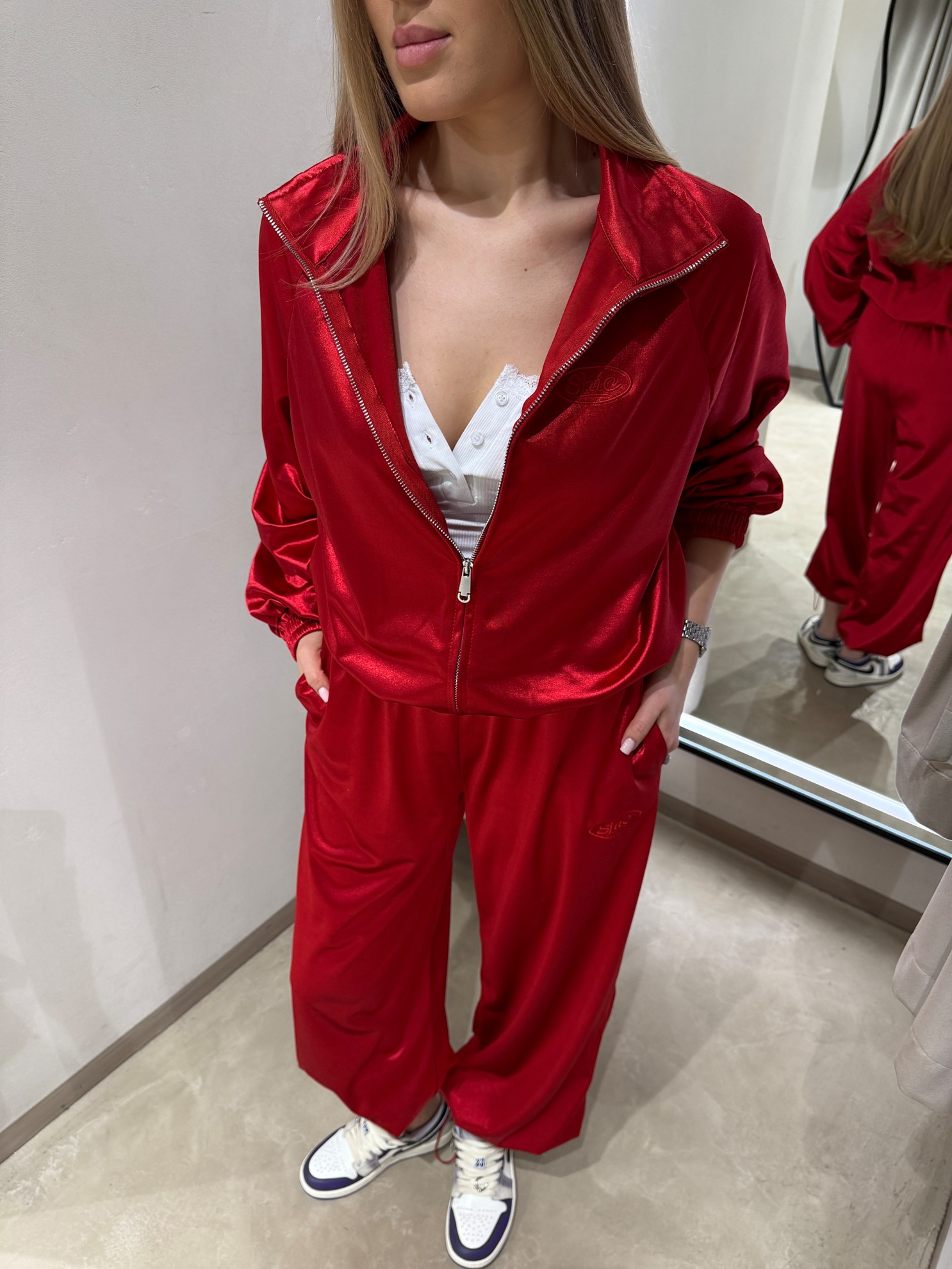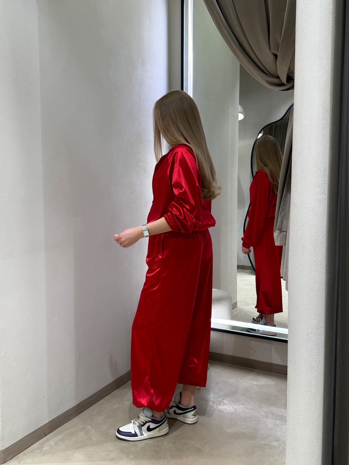 Комплект из куртки на молнии и свободных брюк кюлотов. Воротник-стойка, длинные рукава с эластичными манжетами. Брюки с эластичным поясом и боковыми карманами. Однотонная фактурная ткань с легким блеском.