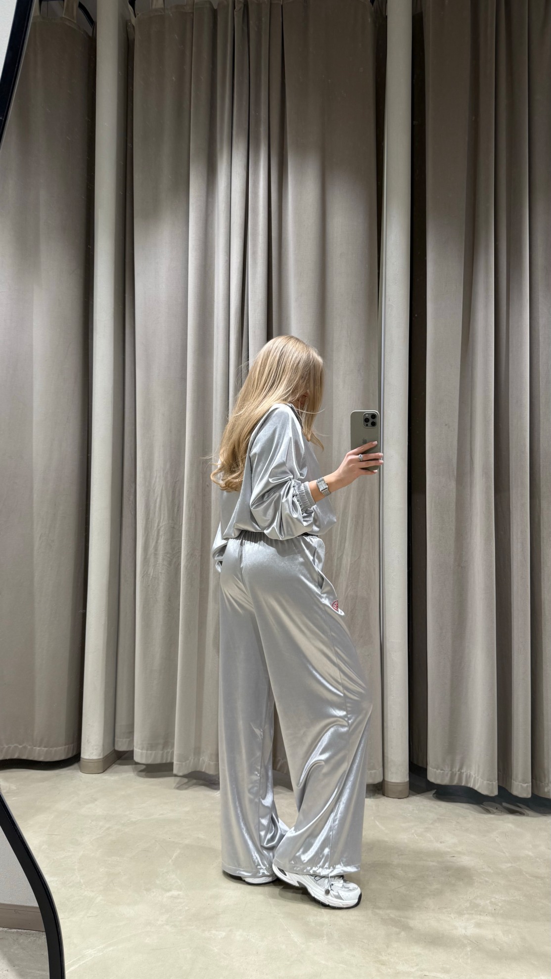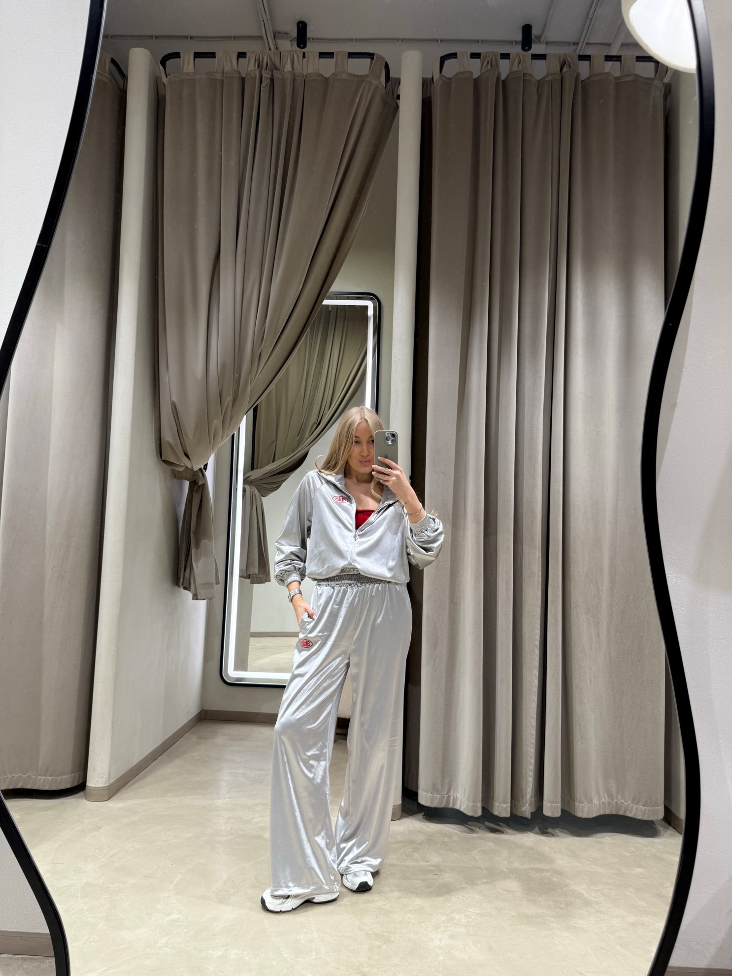 Комплект из олимпийки и прямых брюк свободного кроя из металлизированной ткани. Укороченная олимпийка на молнии с воротником стойкой, длинными рукавами на резинке и контрастной нашивкой спереди. Брюки с эластичным поясом на кулиске и боковыми карманами.