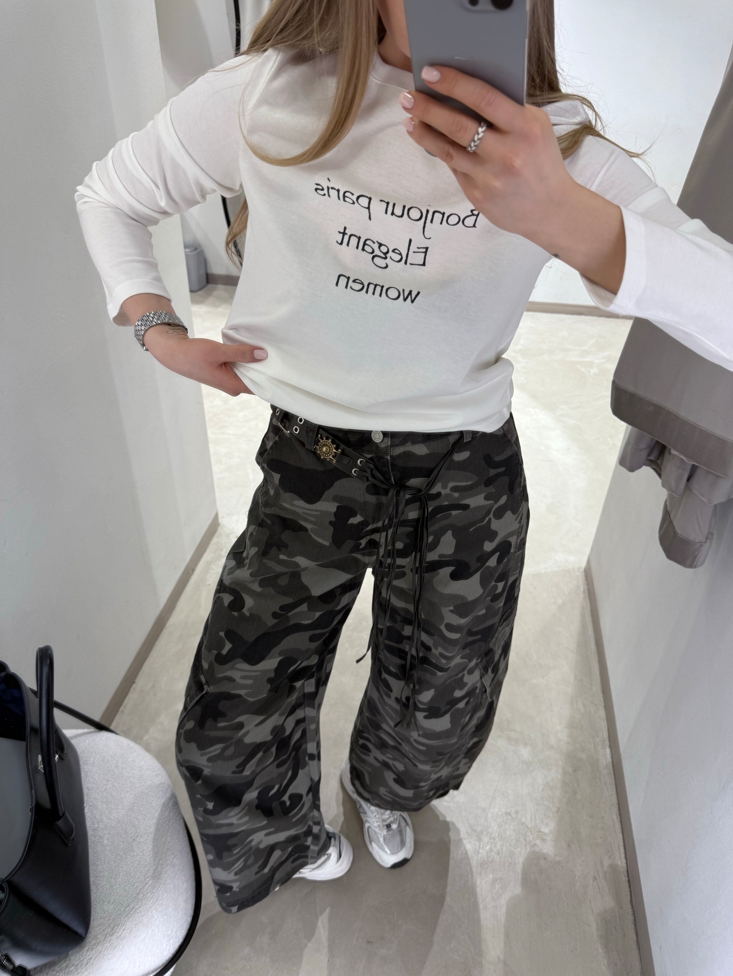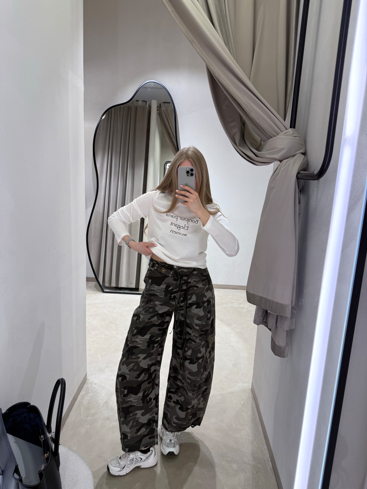 Брюки прямого свободного кроя с камуфляжным принтом. Пояс с пряжкой и завязками спереди. Накладные карманы по бокам. Застежка на молнию и пуговицу.