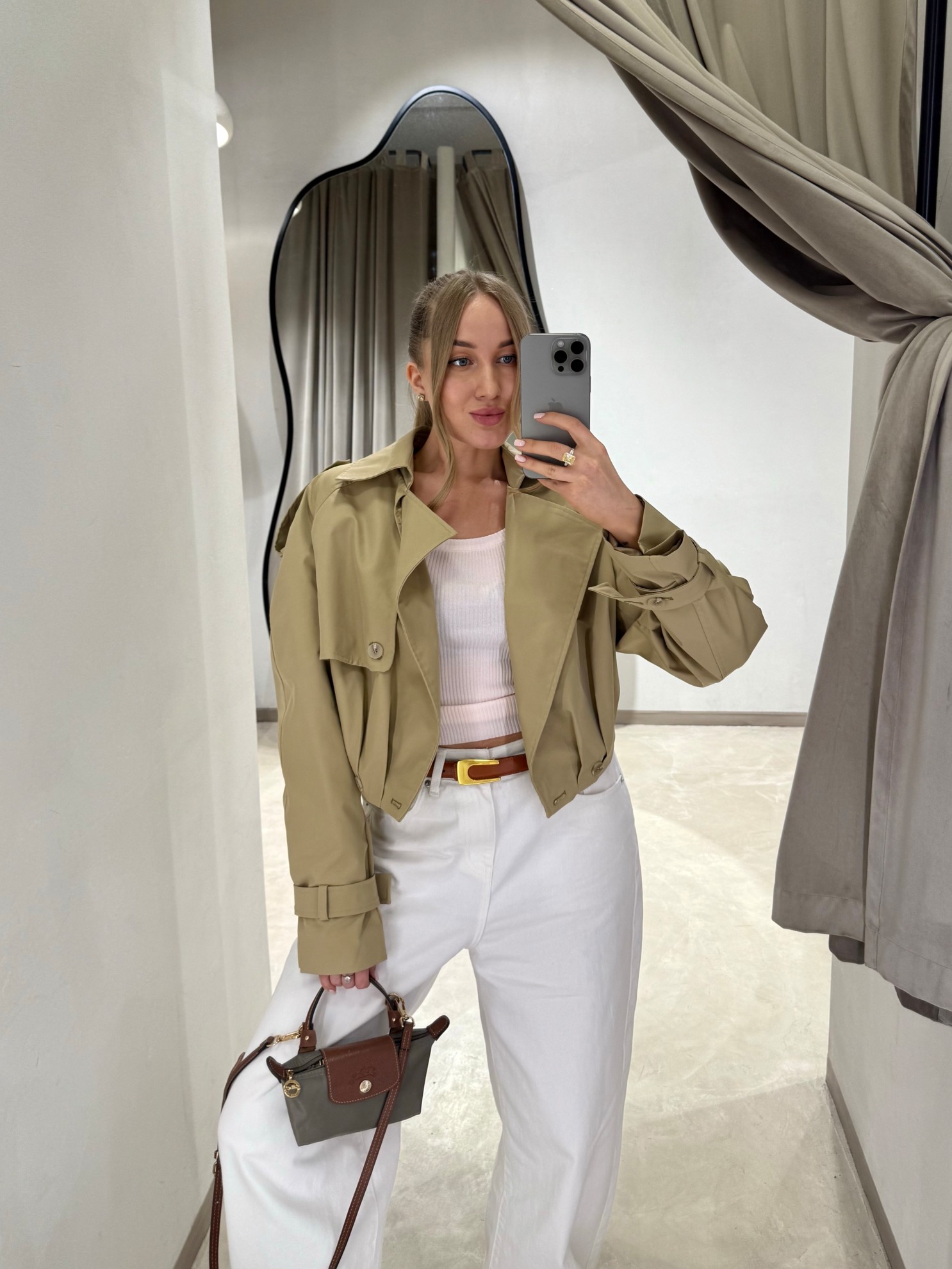 Укороченный двубортный тренч с отложным воротником, погонами на плечах и хлястиками на манжетах. Застежка на пуговицы. Прямой крой со шлицей сзади. Плотная плащевая ткань на подкладке.
