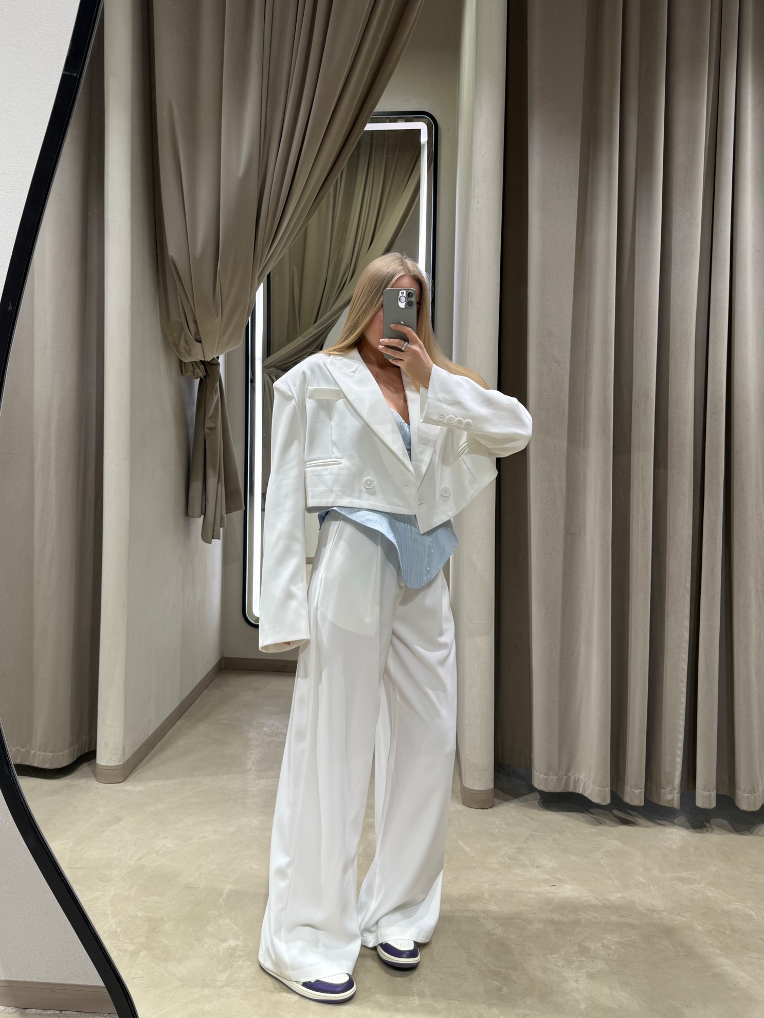 Укороченный двубортный жакет прямого кроя с V-образной линией борта и застежкой на пуговицы. Топ корсетного типа с формованными чашками и удлиненным фигурным низом. Прямые широкие брюки с высокой посадкой и гладким поясом.