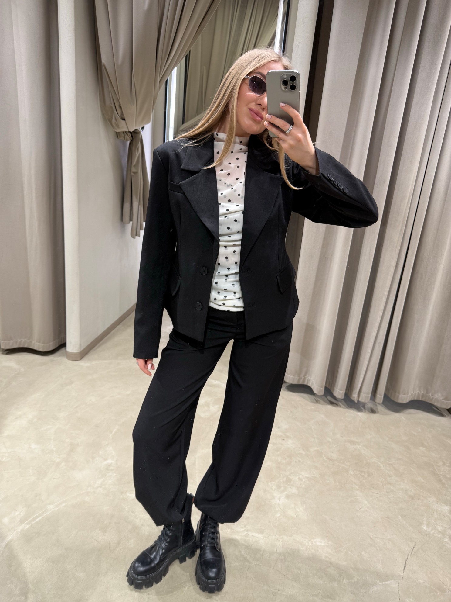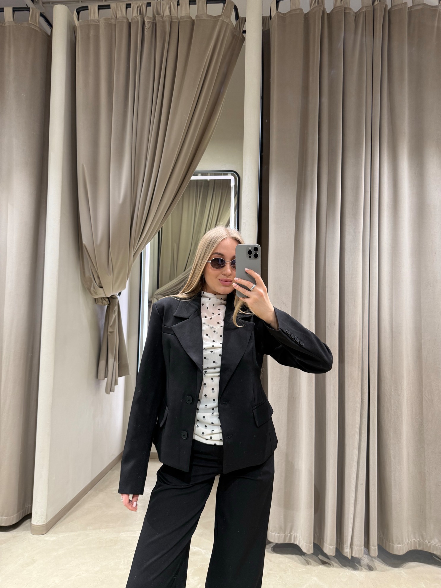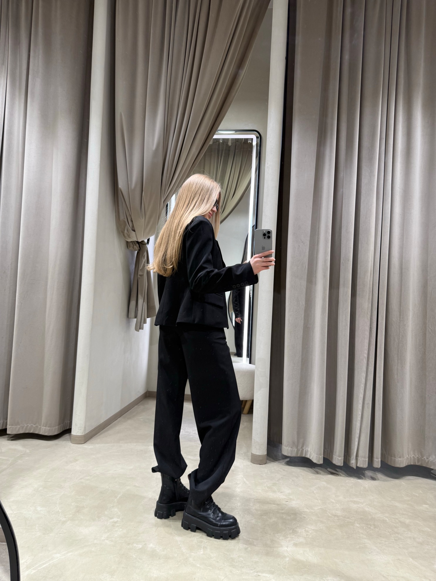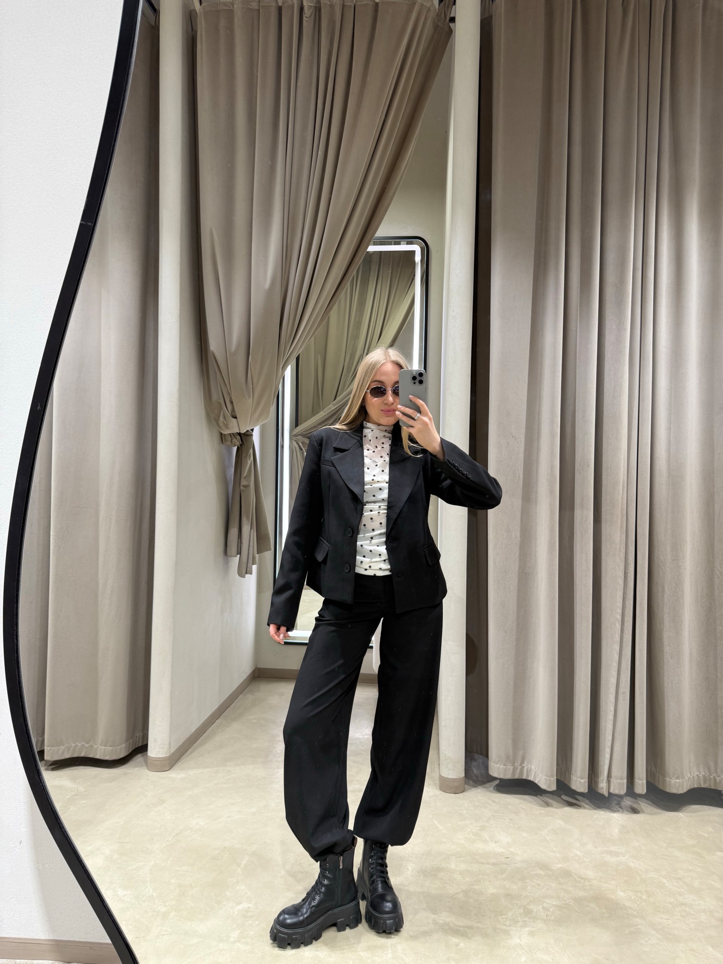 Брючный комплект из прямых брюк средней посадки и укороченного приталенного жакета с отложным воротником, лацканами и накладными карманами с клапанами. Застежка брюк на пуговицу и молнию, застежка жакета на пуговицы.