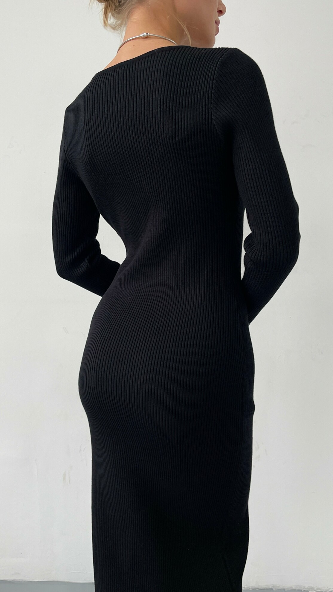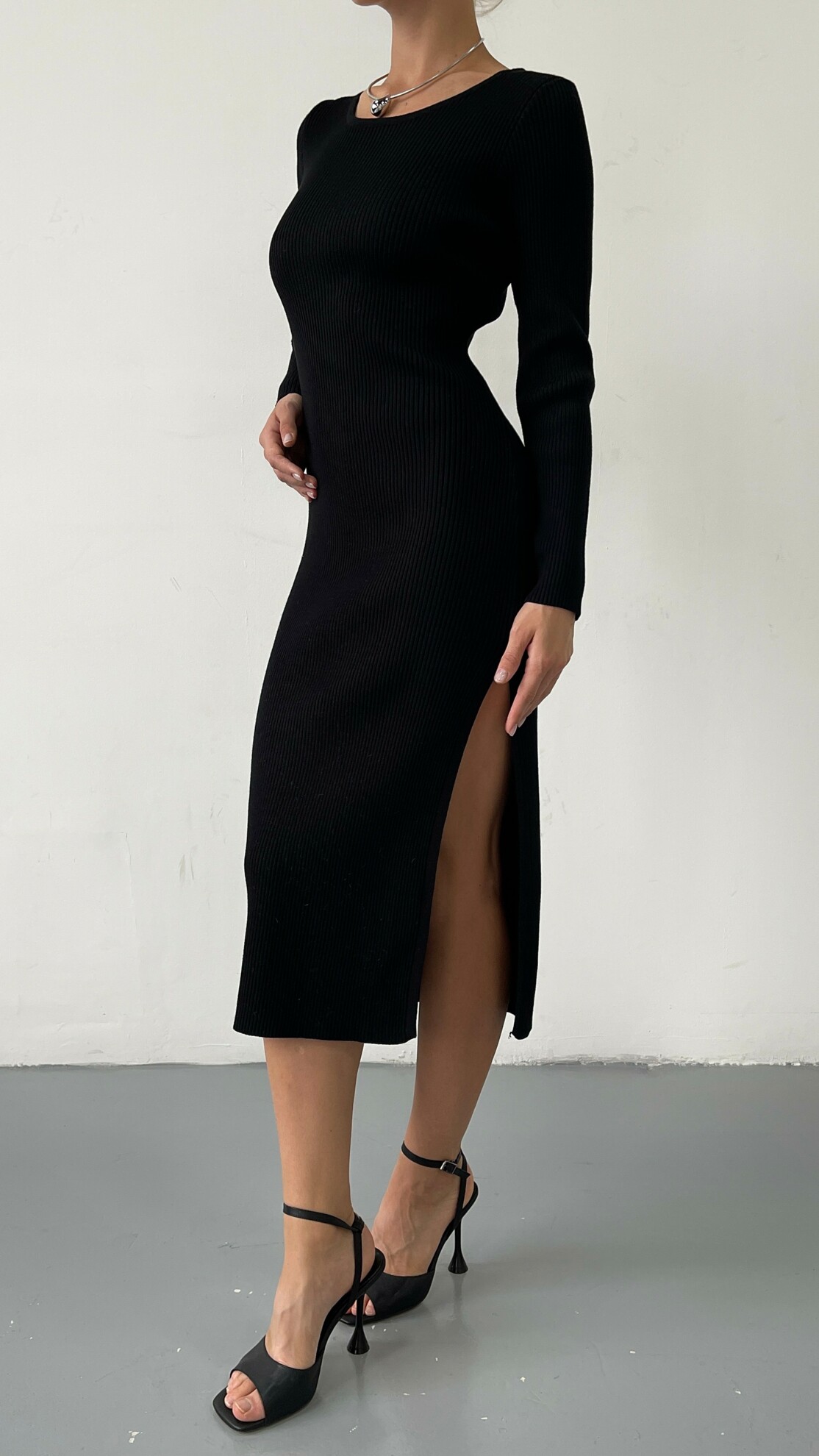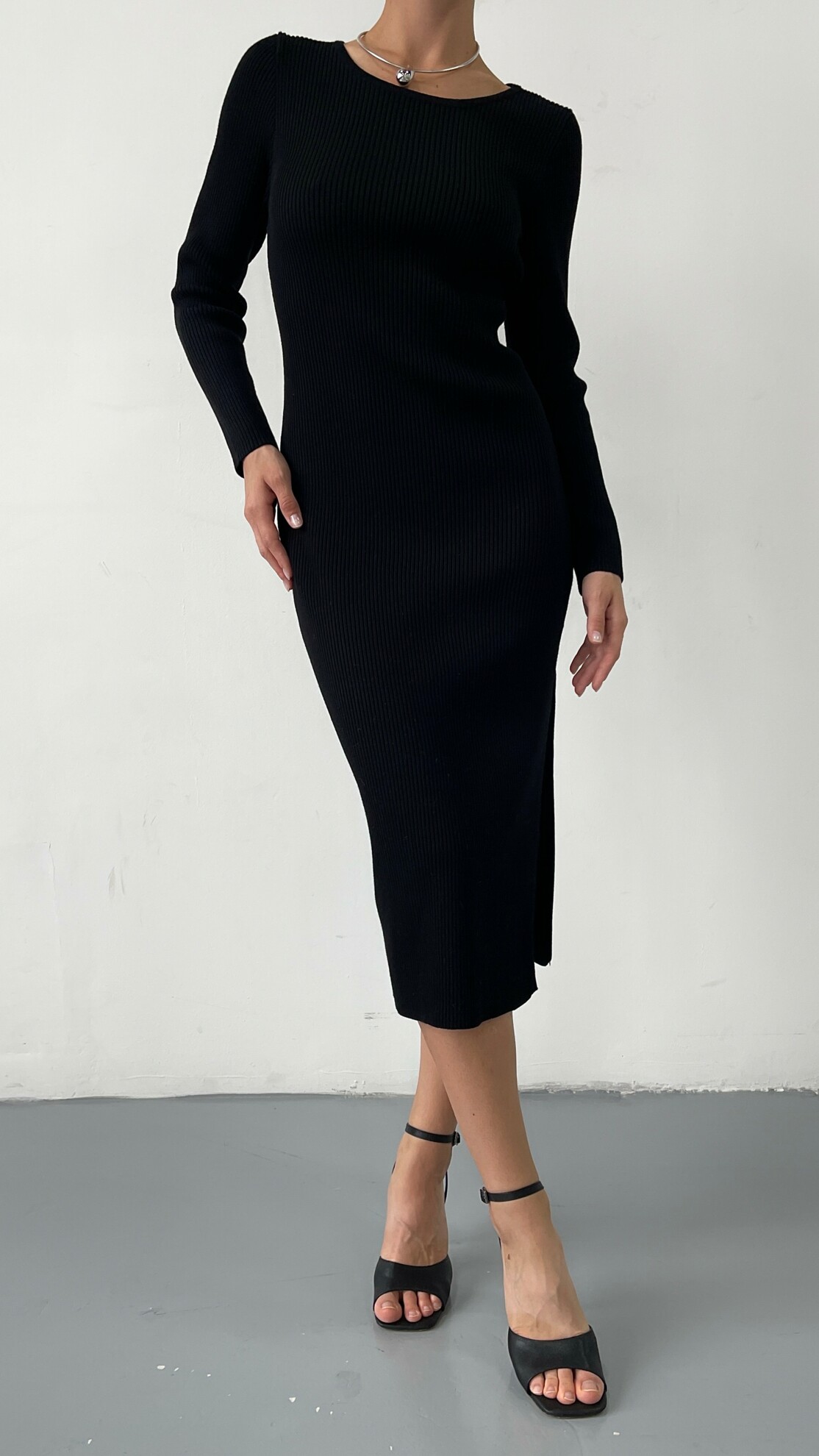 Трикотажное платье миди с длинными рукавами и круглым вырезом. Облегающий крой подчёркивает силуэт. Боковой разрез от бедра добавляет изящности и свободы движений.