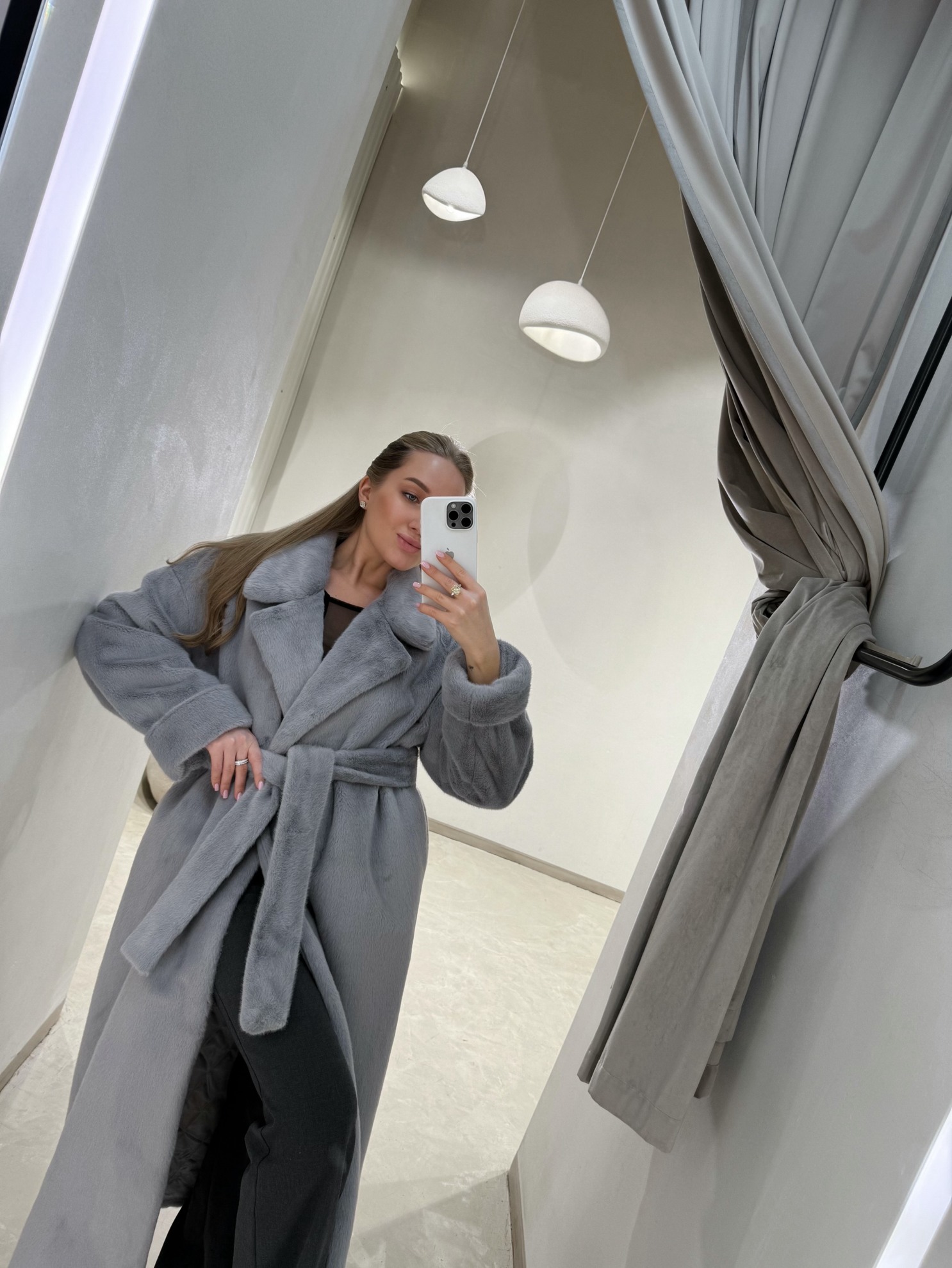 Длинная шуба на запах прямого кроя с поясом. Воротник пиджачного типа с широкими лацканами. Длинные рукава. Боковые карманы в швах. Разрез по низу. Подкладка по всей длине.