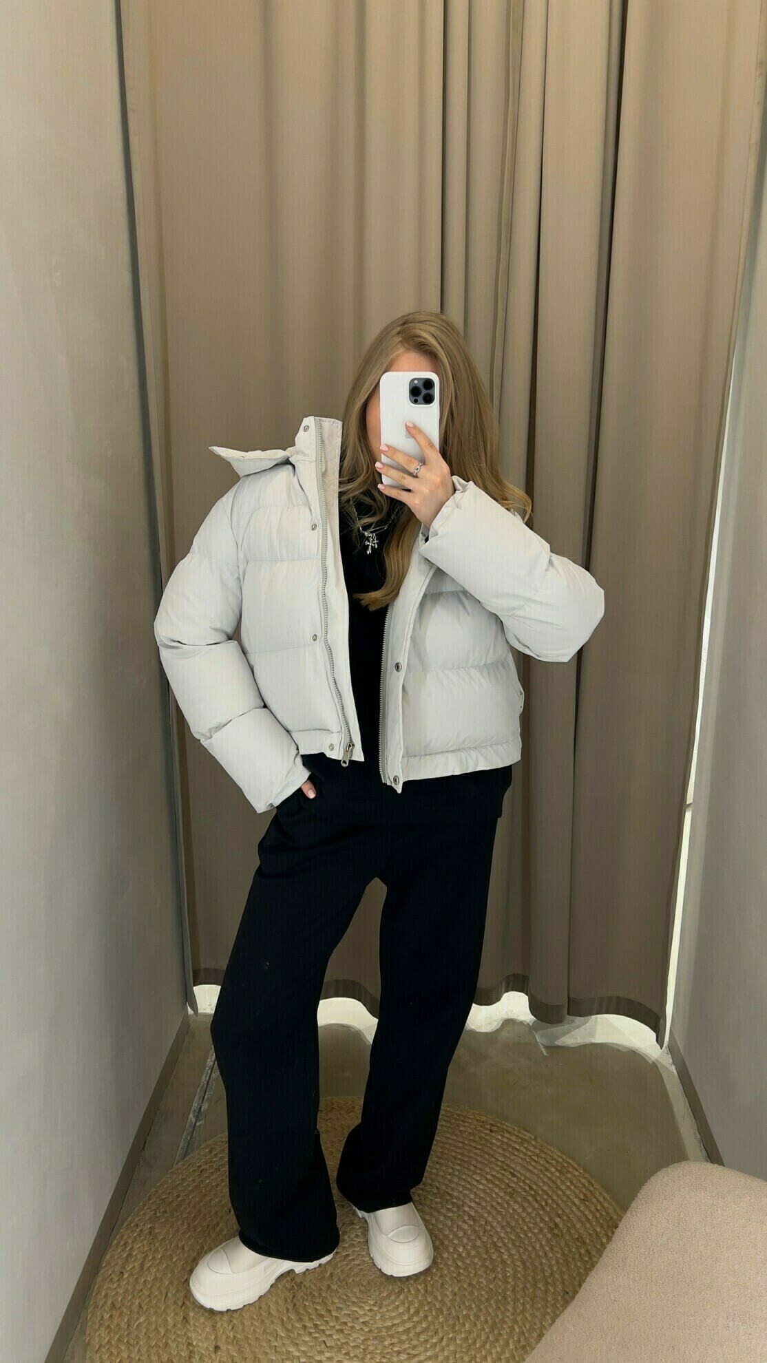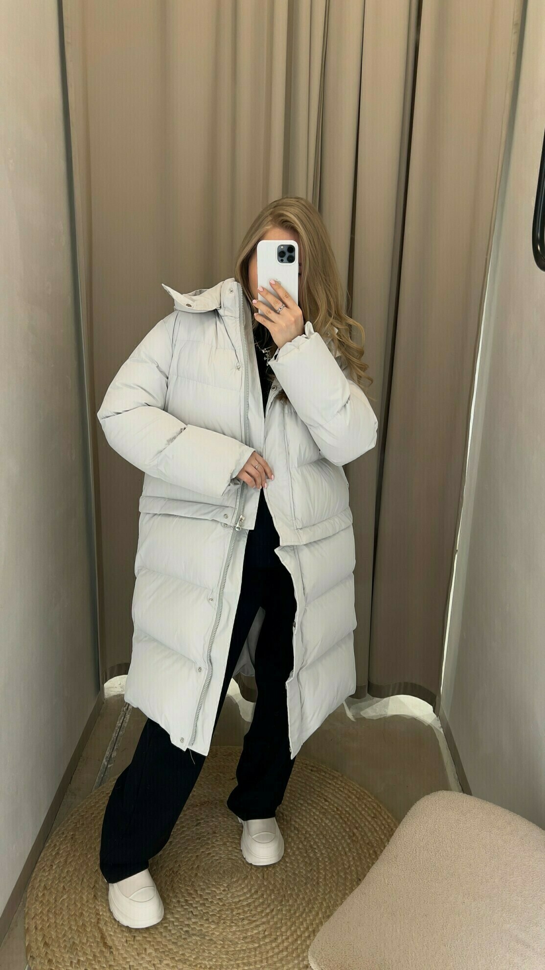 Длинная стеганая куртка с объемным воротником. Утепленная модель с застежкой на молнии и скрытыми кнопками. Также представлена укороченная версия с аналогичными характеристиками.