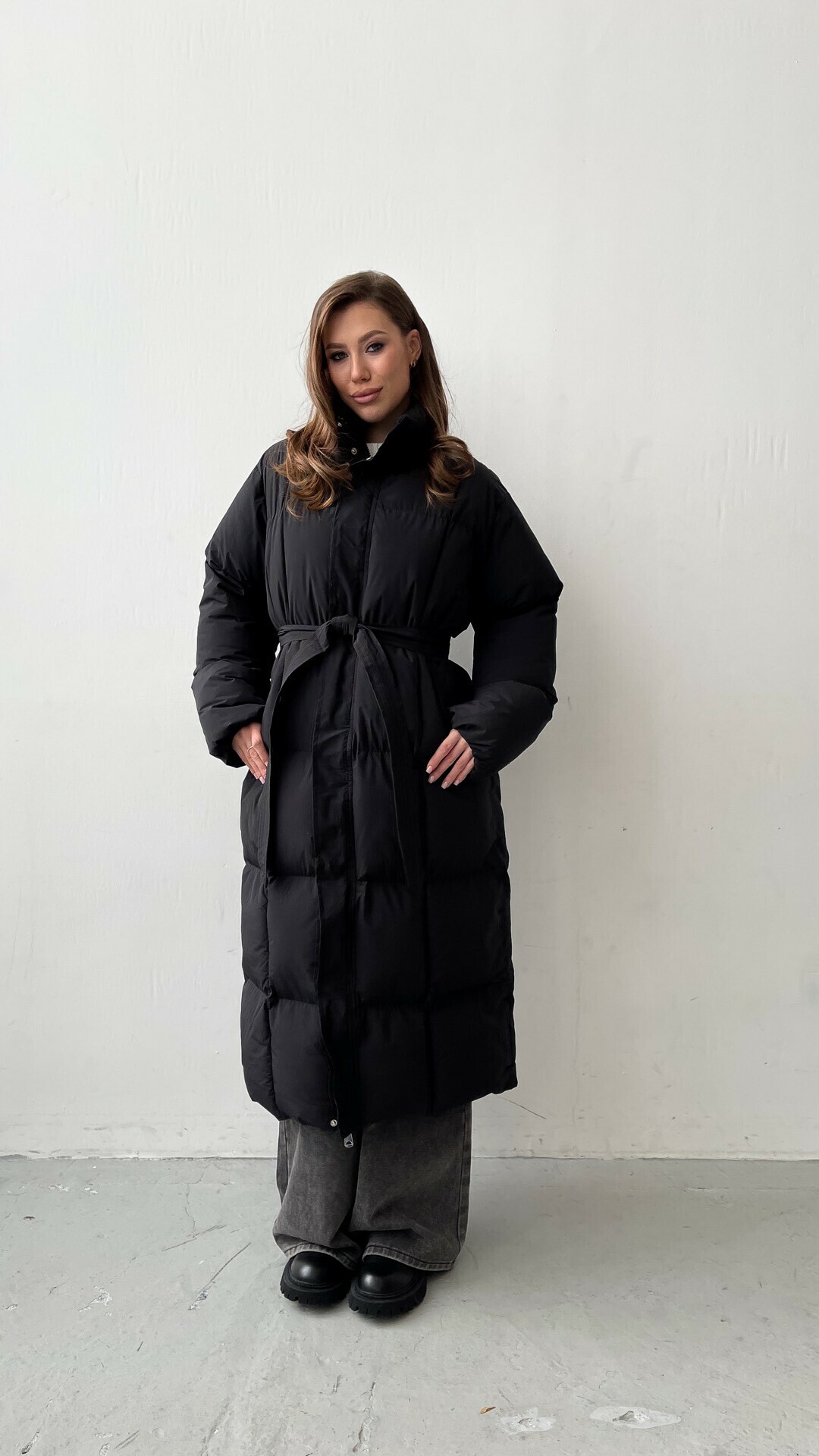 Пуховик длиной до середины икры. Объемный силуэт с поясом на талии. Высокий воротник и длинные рукава. Застежка на кнопки спереди.