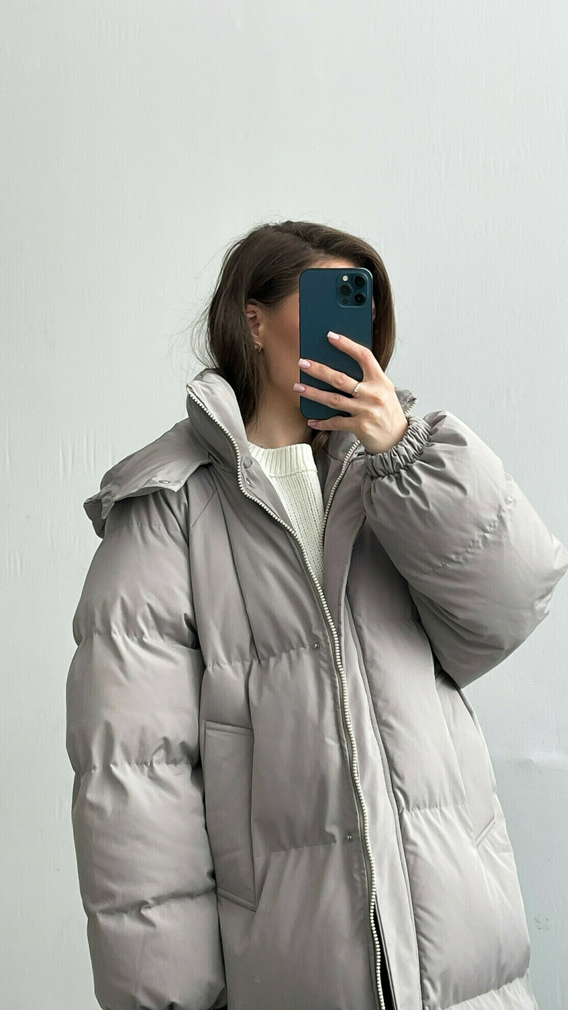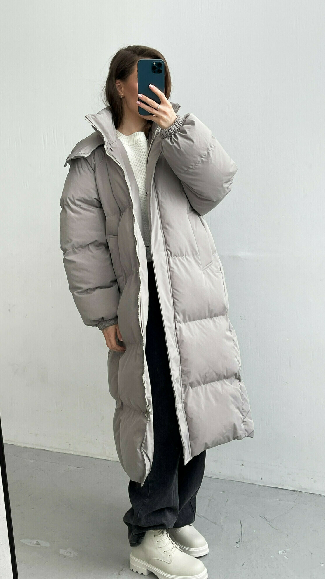 Длинный стеганый пуховик с высоким воротником. Просторные передние карманы. Застежка на молнии по всей длине. Резинки на манжетах.