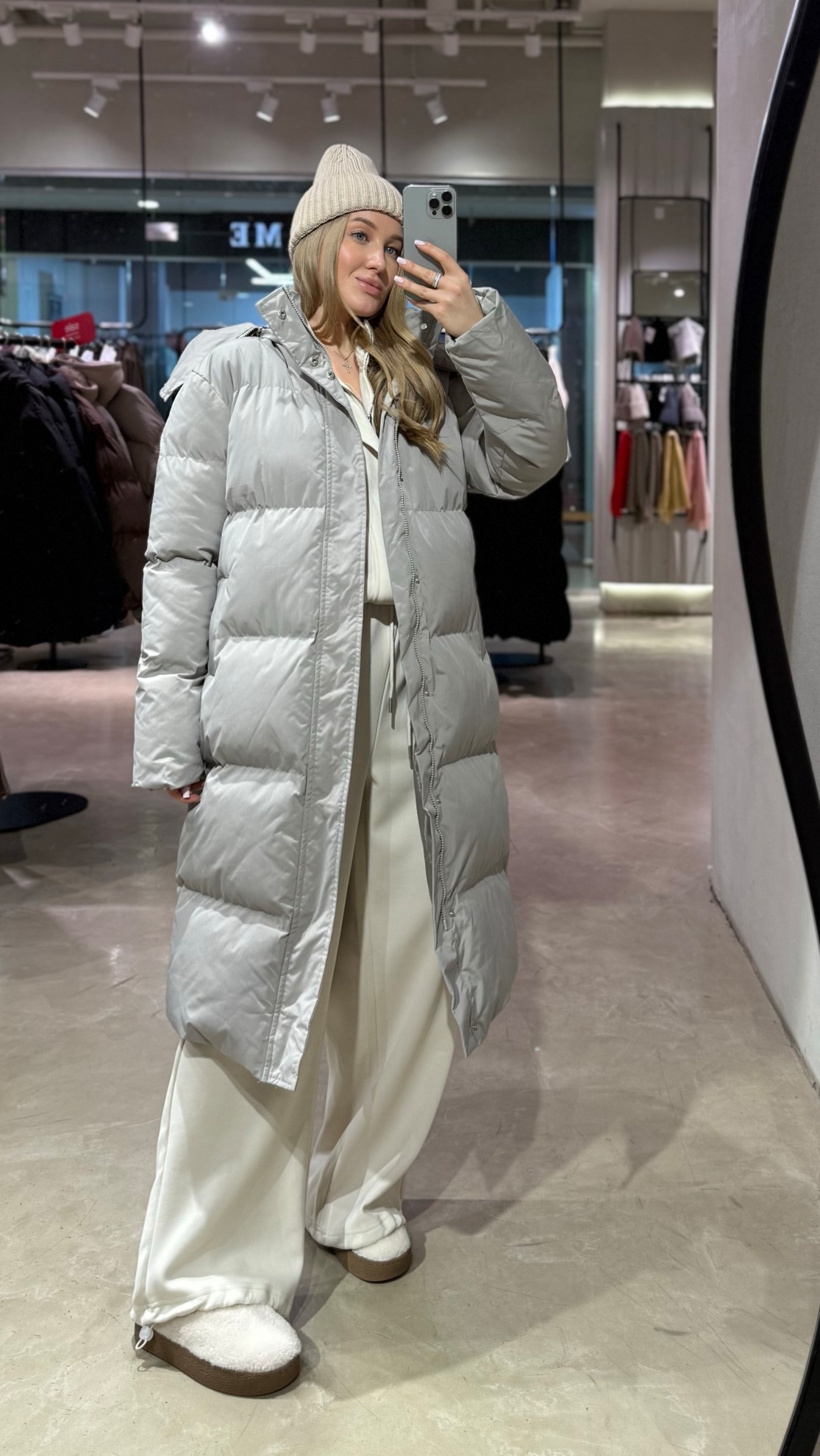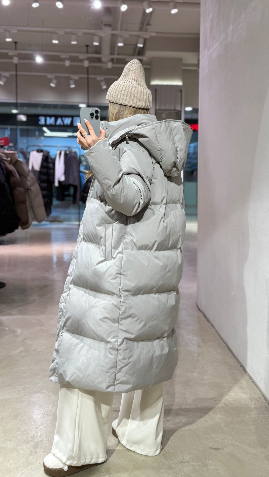 Длинный стеганый пуховик прямого кроя с высоким воротником. Объемные рукава собраны на эластичные манжеты. Центральная застежка на молнию и кнопки. Разрезы по бокам для удобства движения.