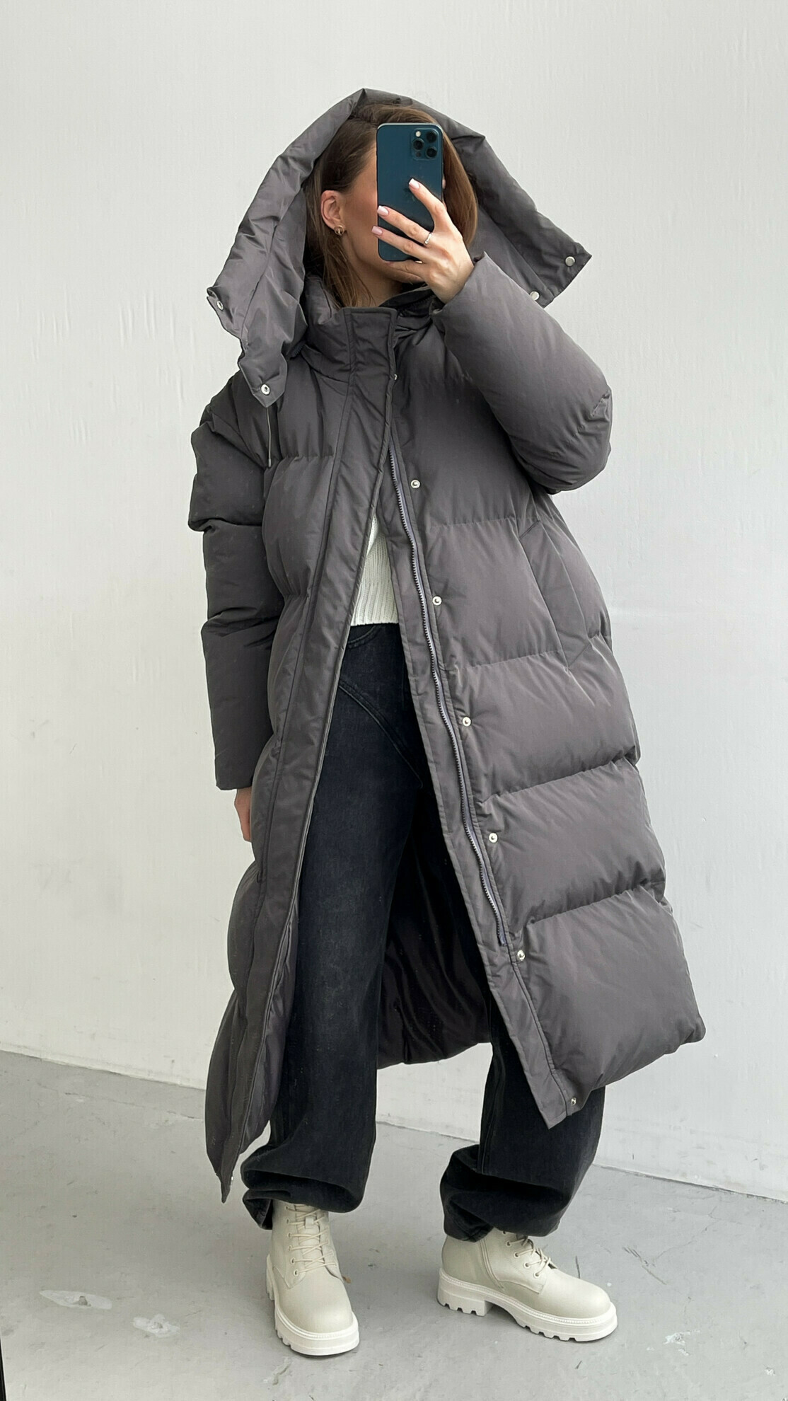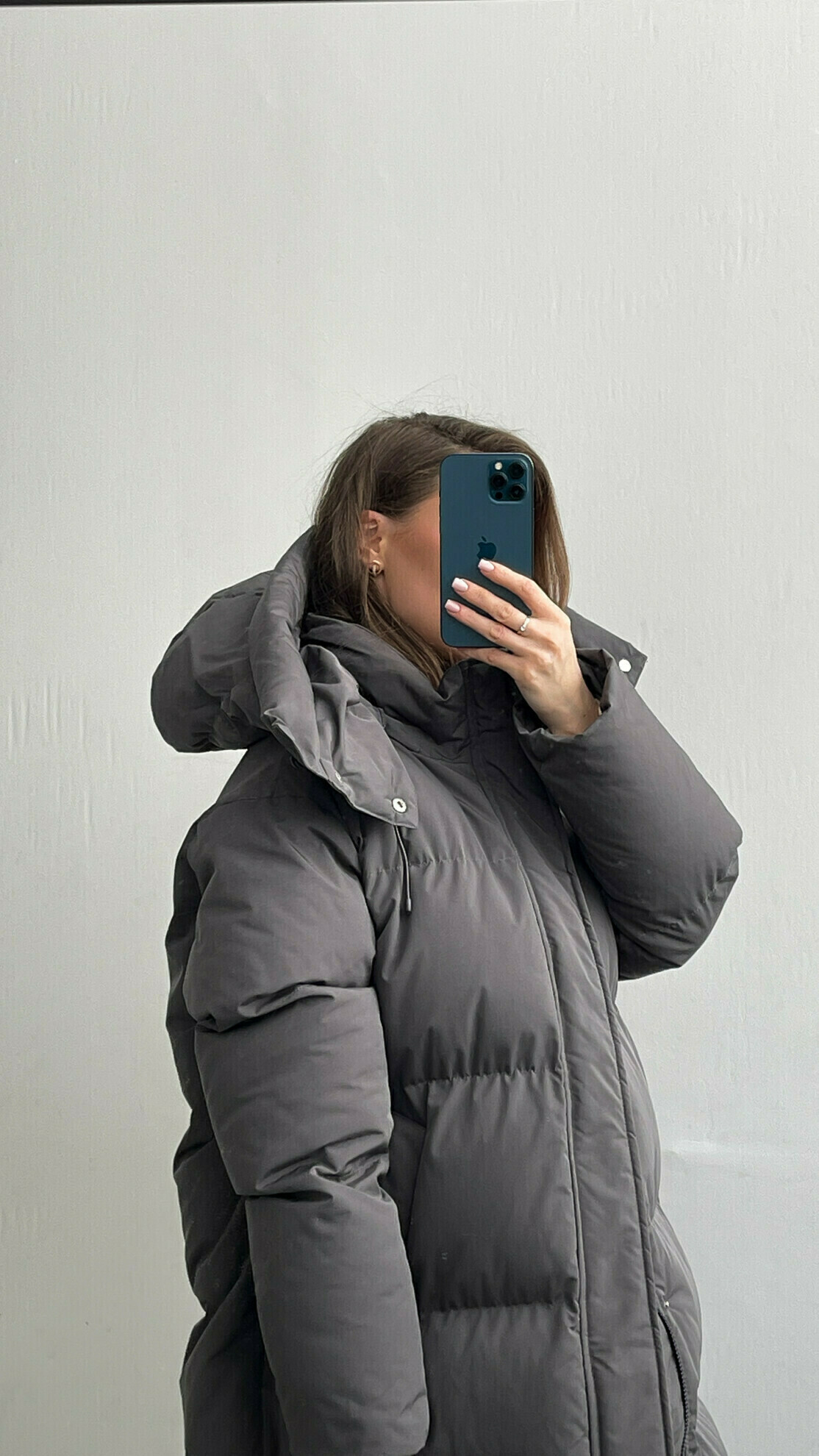 Пуховое пальто с длинным рукавом и объемным шарфом-капюшоном. Модель с застежкой на кнопки. Прямой крой и текстура с эффектом стеганности. Глубокий цвет и плотный материал обеспечивают утепление.