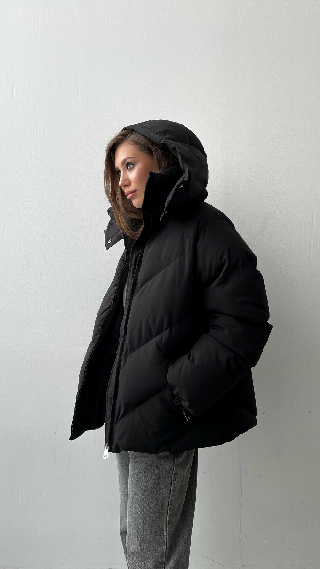 Уютная и объёмная утеплённая куртка с высоким воротником и встроенным капюшоном. Универсальный чёрный цвет. Застёгивается на молнию и кнопки.