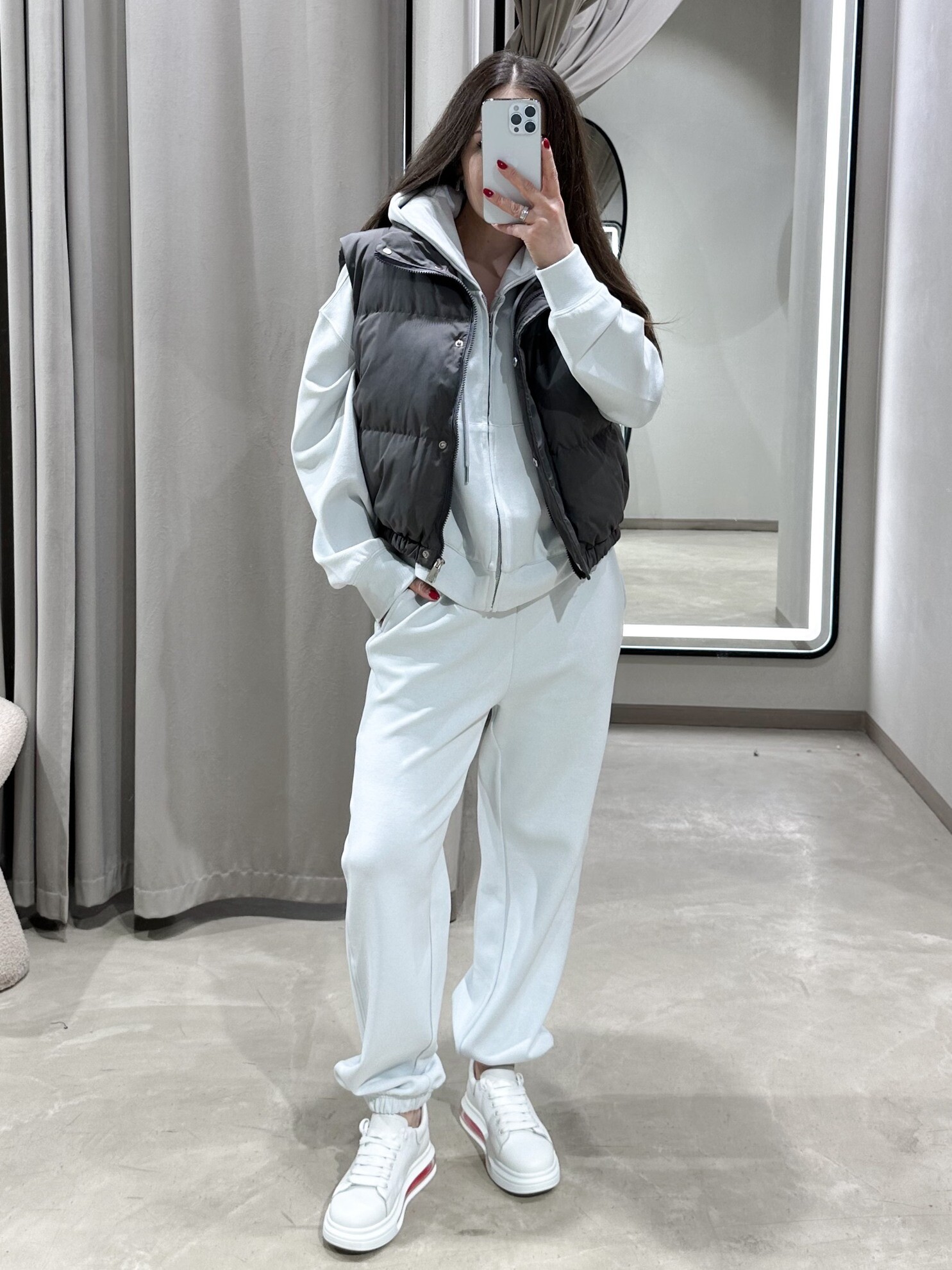 Укороченный объемный жилет с воротником-стойкой. Лаконичный дизайн с застежкой на молнию и кнопки. Боковые карманы.