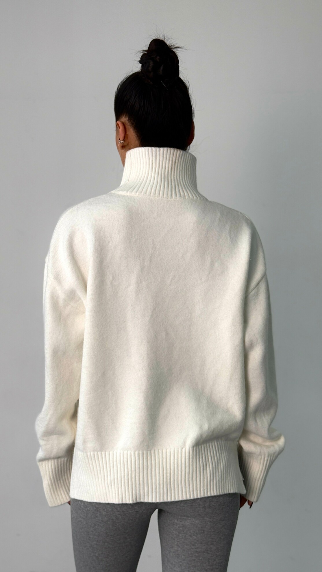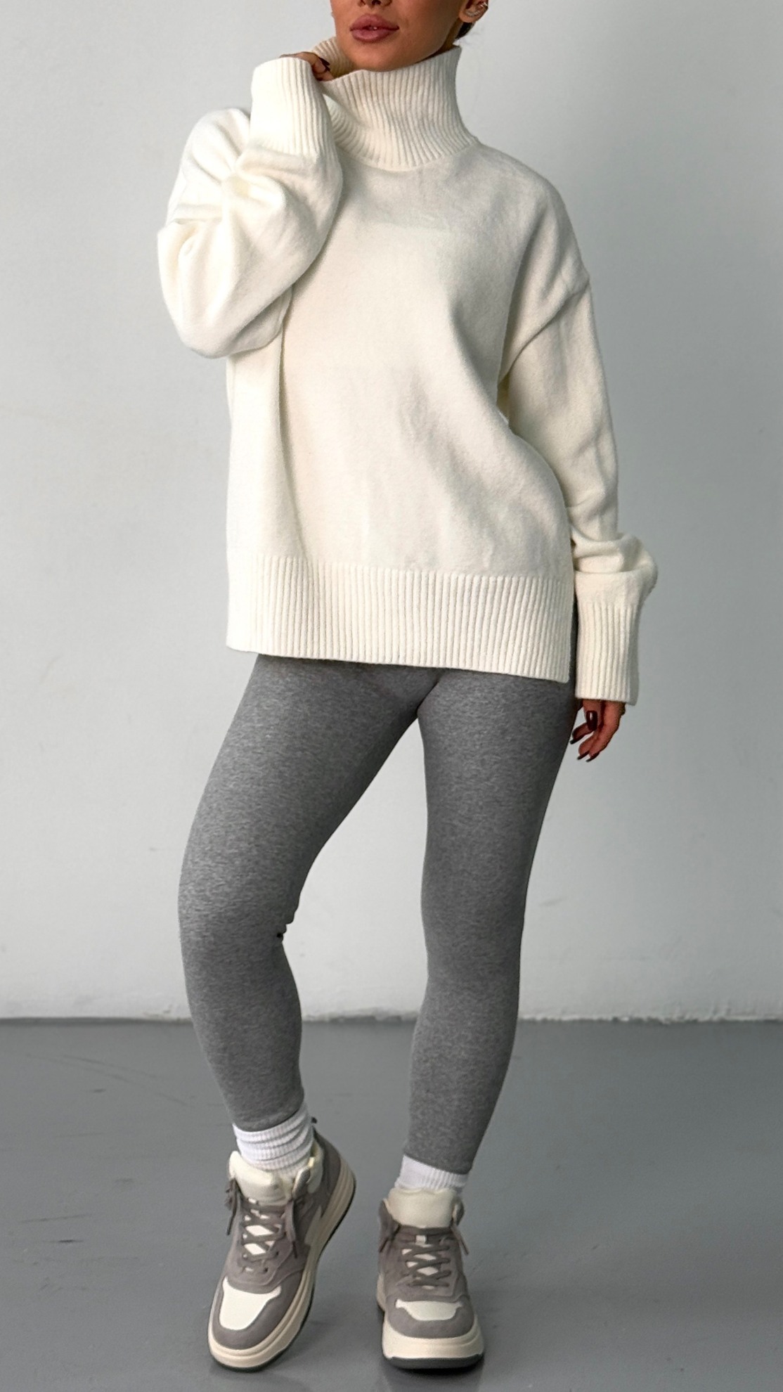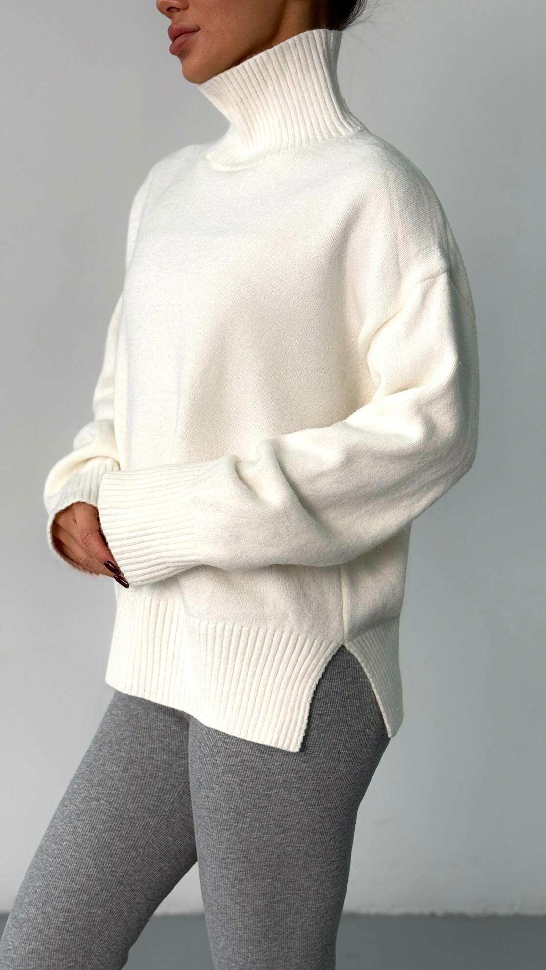 Свитер прямого свободного кроя с высоким воротником-гольф и спущенной линией плеча. Длинные рукава оформлены широкими эластичными манжетами. Нижний край выполнен на широкой резинке с небольшими боковыми разрезами. Трикотажное полотно средней плотности.
